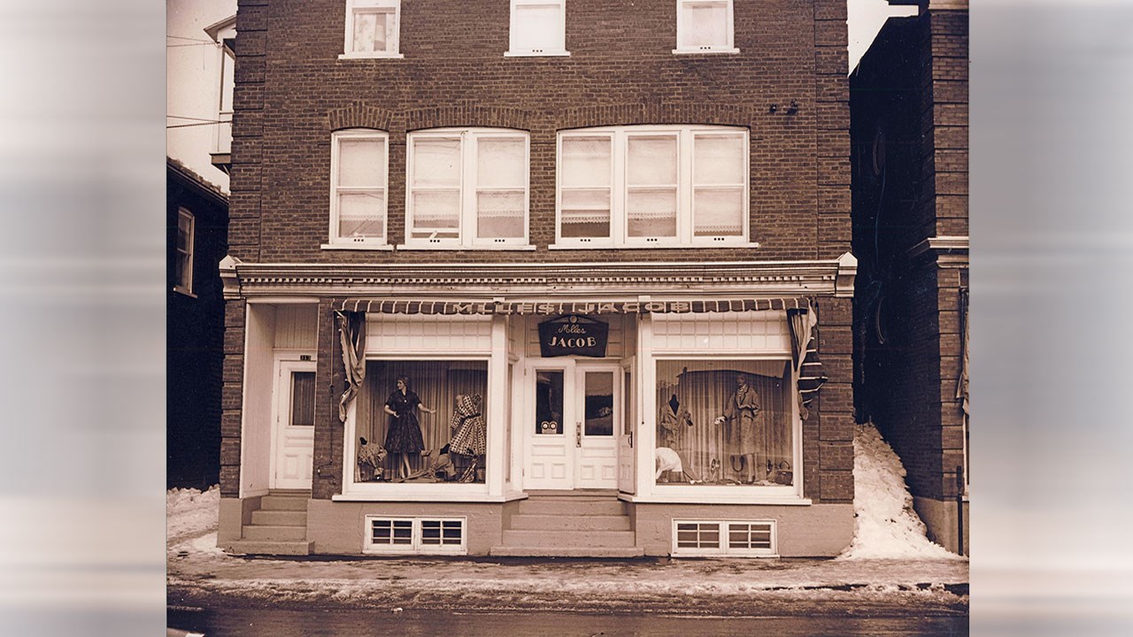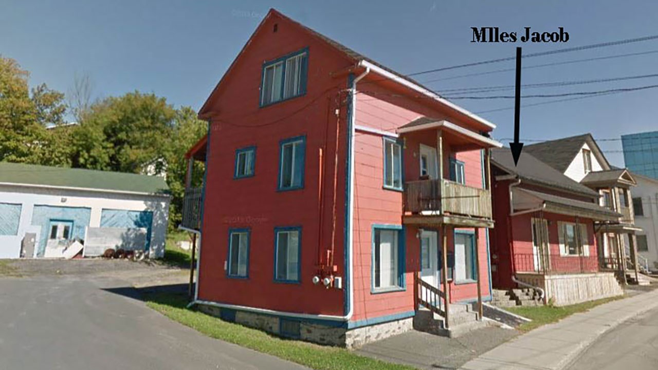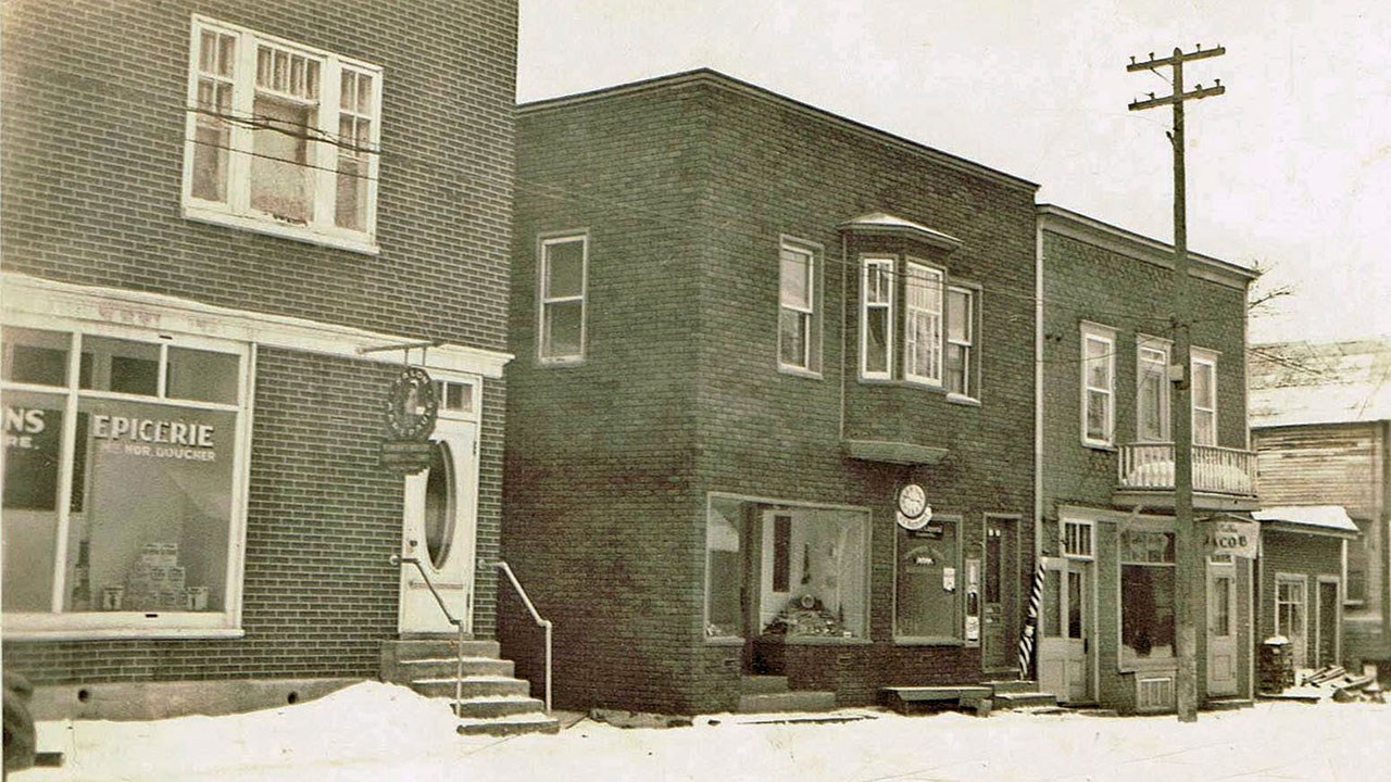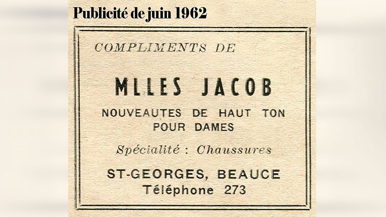 Voyez le magasin de Mlles Jacob à droite sur la 1re photo. Cet établissement fut très populaire dans les années '50. Il appartenait aux trois soeurs Jacob, filles du forgeron Zéphirin Jacob (photo 2). La première à gauche est Marguerite, née en 1914. Celle du milieu est Adrienne, née en 1902. Et celle de droite est Juliette, née en 1901. Vous vous demandez si leur nom n'était pas plutôt «Melles Jacob»? La réponse se trouve sur leur petite annonce publicitaire publiée dans le journal en juin 1962 (photo 3). C'était bien «Mlles Jacob» comme c'est aussi écrit sur leur enseigne de la photo 6. Elles offraient des «nouveautés de haut ton pour dames», spécialement les chaussures. C'est vers 1935 que fut fondé ce magasin. Que des dames se lancent en affaires à cette époque était un exploit hors de l'ordinaire, car les banques refusaient de prêter à des femmes, à moins d'obtenir des garanties substantielles. Démarrer un tel commerce a dû leur demander beaucoup d'audace et de persévérance. À ses débuts, il était situé dans un immeuble très modeste de la première avenue, entre le plombier Brousseau à droite et le barbier Labbé, et le bijoutier Georges E Rancourt à gauche (photo 4, vers 1940-41). Ce site correspond aujourd'hui à endroit où se trouve le restaurant-bar Rock Café. À l'époque, la plupart des édifices de ce secteur, entre la 1re avenue et la rivière, étaient partiellement inondés presque à chaque année par les déplaisantes débâcles printanières, comme on le constate à la 5e photo prise vers le 21 avril 1939, où on voit le magasin de Mlles Jacob semblant flotter dans l'eau. Elles ont fini par se lasser de ces inconvénients et se sont relocalisées au cours des années '50 dans les même secteur, mais de l'autre côté de la rue, presque en face de leur site initial, dans un immeuble beaucoup plus attrayant, ayant autrefois appartenu à Amédée Dionne (photo 6). Avant l'arrivée des soeurs Jacob à cet endroit, cet édifice a longtemps été occupé par le marchand Albert Veilleux. Celles-ci y ont fièrement affiché le nom de leur commerce sur la façade et exhibaient leur marchandise dans la vitrine (photo 7). Au fil des ans, elles ont constamment amélioré l'apparence de leur magasin qui est devenu l'un des commerces de lingerie pour dames les plus importants en ville, comme le démontre la photo 8 (vers 1962, leur magasin est le 1er bâtiment à gauche). Une caractéristique nous prouve que les photos 6, 7 et 8 représentent bien le même immeuble: la configuration des fenêtres du 2e étage ne trompe pas. Cet édifice existe encore et accueille aujourd'hui au restaurant Éline Pizza. Non seulement le trio des soeurs Jacob ont-elles exploité ensemble leur commerce pendant environ 40 ans, elles ont aussi cohabité longtemps dans leur résidence située à quelques rues plus au nord sur la 1re avenue en face du centre d'achats Place Centre-Ville. Leur ancienne maison fut démolie le 25 septembre 2018 pour faire place à la nouvelle bâtisse de la Banque Nationale. Marguerite est décédée en 1996 à l'âge de 82 ans, Adrienne en 1988 à 86 ans et Juliette en 1982 à 81 ans. Sûrement que beaucoup de georgiennes se souviennent encore d'être allées magasiner autrefois au chic établissement des soeurs Jacob. Elles font partie de la belle histoire de Saint-Georges.
