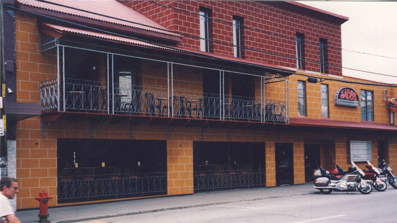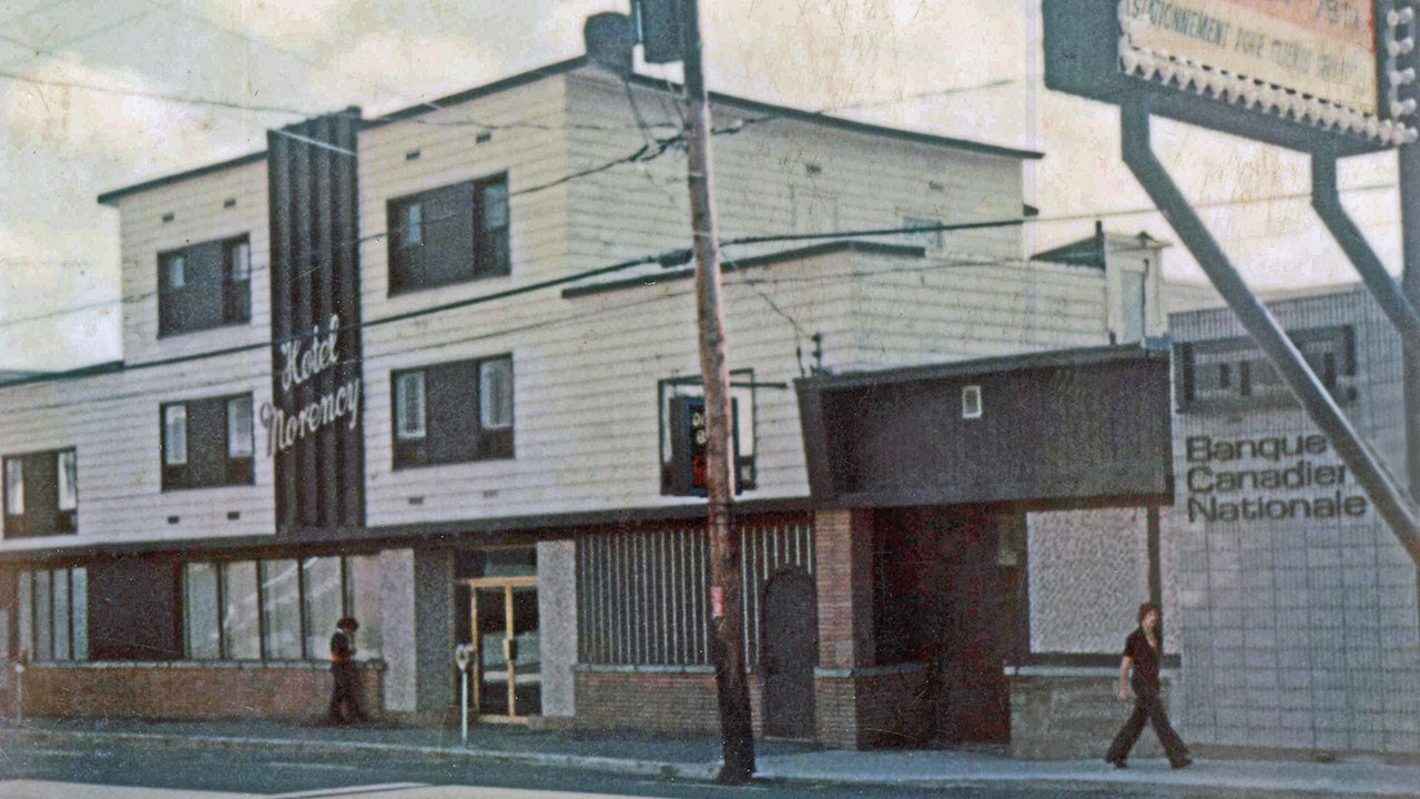 «Alors, on traverse au Morency?» Voila une question que l'on entendait souvent quand on «veillait» au Manoir le vendredi ou samedi soir. Il y avait un constant va-et-vient entre ces deux temples de la danse et de la musique. L'ouverture de la grande salle du Morency eut lieu en septembre 1956 (photo 1, vers 1965). De l'extérieur, faut reconnaitre que cet édifice ne payait pas de mine, très dépouillé comme immeuble. Mais c'était en dedans que ça se passait, la salle était très vaste et il y avait de bons groupes musicaux, en plus de nombreuses réceptions de toutes sortes. Il y avait vraiment de l'action les fins de semaine. C'est M. Frédéric Morency qui a été le fondateur de cette dynastie. Dans les années '60, c'est sa fille Georgette (mieux connue sous le nom de Georgette Jacob) qui en a été la propriétaire et administratrice. Si vous avez fréquenté cet endroit dans les années '60 ou '70, vous l'avez sûrement vue, elle était presque toujours assise sur son tabouret en arrière de la caisse enregistreuse, ayant la vue sur tout ce qui se passait dans son établissement. Sur la photo 2, nous voyons l'immense salle de réception qui pouvait loger 600 personnes assises. À l'époque, cette grande salle de réception occupait tout l'espace où sont aujourd'hui le Bar Jack Saloon et la Banque CIBC, en plus de la très populaire taverne du Morency qui se trouvait à l'autre extrémité, au sud de l'édifice, là où se trouve maintenant la micro-brasserie La Société. La photo 3 nous montre le même hôtel vers 1975, dont la façade a été complètement transformée puisqu'une partie de l'édifice a été amputée (côté nord) pour la louer à la Banque Canadienne Nationale qui y a établi sa succursale pendant plusieurs années. Dans les années '80, il y eut la discothèque Chez Frédéric ainsi que le Bar le Jacob (photo 4). Le choix des appellations des bars Morency, Jacob et Frédéric ne fut pas le résultat du hasard, on réalise que ce sont les noms ou prénoms de membres importants de cette famille.