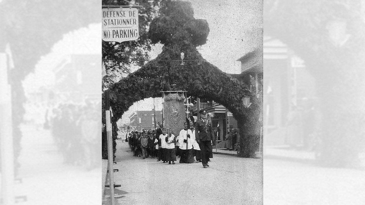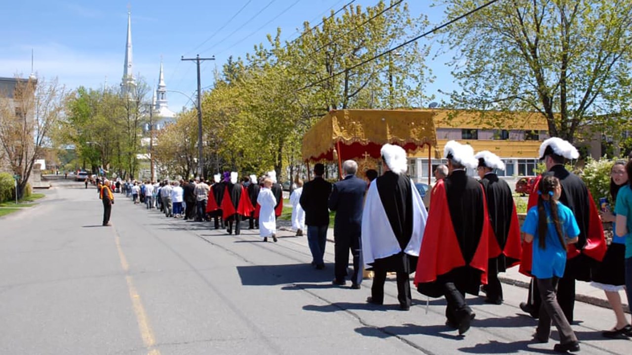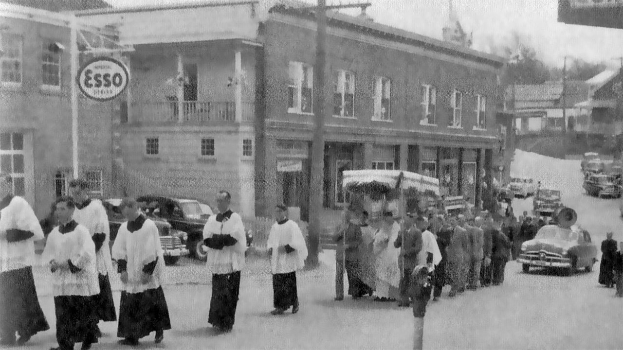 Il y a 100 ans, la ferveur religieuse était à son comble chez nous. La quasi-totalité des gens allaient à la messe à chaque dimanche et se conformaient strictement aux préceptes édictés par les autorités catholiques, parfois aussi astreignants que de jeûner au moins 12 heures avant de pouvoir communier ou de se priver partiellement de nourriture pendant le carême. Le summum était les nombreuses processions nous faisant déambuler en parade sur les principaux artères un peu partout en ville: la Fête-Dieu, la Fête du Sacré-Coeur, Fête de l'Assomption, la Fête aux flambeaux et bien d'autres, surtout pendant la période estivale. Généralement, pendant la procession, le prêtre portait l'Eucharistie dans un ostensoir et défilait abrité sous un dai porté par quatre participants. On possède plusieurs photos de ces longues processions se déplaçant en rangs serrés en différents endroits au centre-ville, comme sur la 1re avenue en 1919 (photo 1) et sur la 2e avenue en 1956 (photo 2). Parfois, les organisateurs érigeaient d'énormes arches faites de branches de sapin au-dessus de la rue où passait la parade. Une très ancienne, vers 1906, sur la 1re avenue au centre-ville (photo 3). On en voit une en face du magasin de l'horloger Alfred Perron (aujourd'hui Jouets Place Bureau) pas loin de la 123e rue vers 1907 (photo 4). Une autre vers 1938 à peu près en face de la Banque Royale (photo 5). Même une dans l'ouest près de la 24e rue vers 1960, maison Yvon Thibaudeau (photo 6). Le moment le plus important était l'arrêt au reposoir, endroit où on avait érigé un autel temporaire, là où le prêtre procédait à une cérémonie religieuse et donnait sa bénédiction. Une photo extraordinaire montrant le reposoir des frères Thibaudeau à leur magasin sur la 1re avenue vers 1922 (photo 7). Pendant plusieurs décennies, les propriétaires géorgiens rivalisaient d'ingéniosité pour ériger le plus extravagant reposoir sur le seuil de leur résidence. Voyez les gens agenouillés dans l'escalier menant au reposoir installé devant l'ancienne maison de Gédéon Gagné sur la 2e avenue (photo 8). On changeait de place à chaque année, et c'était à qui aurait le plus beau jamais réalisé. Celui chez le maire Rémi Bolduc sur la 2e avenue coin 123e rue en 1927 (photo 9). C'était considéré comme un honneur que d'être choisi, comme le démontrent toutes ces photos anciennes. En 1942, sur le parvis de l'église dans l'Ouest (photo 10). La dernière procession à Saint-Georges, à ma connaissance, fut la Fête-Dieu du 25 mai 2008, qu'on voit parader dans la 18e rue à la photo 11. Incroyable: j'ai trouvé une photo ancienne (vers 1936-37) où on aperçoit une imposante structure faite de gros madriers partant de l'ancien pont de fer, avec drapeaux et décorations, où l'on voit des citoyens endimanchés circulant sur cette construction inusitée (photo 12). Il n'y a qu'une manifestation religieuse pour justifier des travaux aussi extravagants. Il semble qu'à cette occasion, on avait même décoré de guirlandes les poutres et les murets de l'entrée du pont, dans l'est (photo 13). La plupart ont aussi connu les processions au flambeau, qui avaient lieu le soir, pour mieux contempler l'éclairage spectaculaire des centaines de participants (photo 14). Puisque les gens marchaient en groupe, la flamme aurait vacillé et se serait éteinte si on ne l'avait pas protégée au moyen du flambeau. On fournissait des portes-cierges constitués d'une chandelle insérée dans un trou pratiqué dans le fond du protecteur cartonné. Mais il arrivait que le feu prenne dans le flambeau... Quels souvenirs.