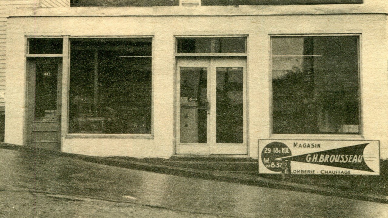Les plombiers Brousseau de Saint-Georges sont les descendants de François (dit Francis) Brousseau dont la famille comptait douze garçons. Onze d’entre eux sont devenus entrepreneurs-plombiers, et le douzième entra en religion. Le premier à venir s’établir à Saint-Georges est Vilmer Brousseau. Né le 5 mai 1900, celui-ci apprit son métier très jeune, à Waterville, et se lança à son compte en 1920. L’année suivante, il s’installait à Saint-Ludger et, en 1929, il venait s’établir définitivement à Saint-Georges, comme plombier et ferblantier, qui étaient des métiers connexes. Son premier local était situé en plein centre-ville, sur la 1re avenue, près de la rivière, à peu près à l’endroit où se trouve aujourd’hui un petit parc gazonné entre la terrasse du resto-bar le Rock Café et la 118e rue menant au pont. On a quelques photos anciennes de son atelier, prises lors de débâcles, dont celle de 1939 (photo 1). Vilmer avait quatre fils qui sont aussi devenus tous plombiers: Georges-Henri à Saint-Georges. Euchariste qui a travaillé pour son frère G.H. Le troisième, Benoit, a déjà été contremaître pour l’aqueduc à Saint-Georges. Et Lorenzo fut aussi entrepreneur-plombier à La Sarre en Abitibi. Georges-Henri débuta dans le métier en 1937 et dès 1941, il participait à la fondation de la compagnie V. Brousseau et Fils. En 1947, il se porta acquéreur du commerce familial et commença à l’opérer sous la raison sociale de G.-H. Brousseau Enr. Au fil des ans, ses fils se sont joints à lui. Vers 1965, ils aménagèrent à l’étage inférieur d’un gros immeuble situé à l’intersection de la 118e rue et de la 2e avenue, dont l’entrée principale était sur le coin arrière nord-est de la bâtisse, au numéro 29 de la 118e rue, (photo 2, de 1968). Cette entrée existe encore, bien que non utilisée par la clientèle, mais son numéro civique a changé, c’est le 160 de la 118e rue. Cet édifice fut construit en 1917 par les renommés frères Bérubé. Le logement supérieur fut longtemps occupé par Mme Arthur Champagne, de 1926 à 1970. Avant que la plomberie Brousseau ne s’établisse au rez-de-chaussée, celui-ci a été occupé par des restaurants, dont le Bon Accueil dans les années ‘70 (photo 3). L’édifice des Brousseau a failli être incendié lors du gros feu qui a détruit son voisin l’Hôtel National en 1977, mais ils furent épargnés (photo 4). En 1992, ils ont acquis toute la bâtisse et ont établi leurs bureaux et la salle d’accueil et de vente à l’avant sur la 2e avenue, partageant l’étage avec un salon de barbier (photo 5, de sept 2016). Voyez une photo aérienne offrant une vue arrière de l’immeuble en 1995 (photo 6 de Yvon Thibodeau). Après le décès de G.H. survenu en 1995, quatre de ses enfants Gilles, Lucille, Jacques et Yves ont pris la relève et continué d’opérer l’entreprise sous le nom de G. H. Brousseau et Fils Inc., entrepreneurs en plomberie et chauffage. Les Brousseau occupent aujourd’hui tous les trois étages de l’édifice (sauf le salon de barbier). Ils jouissent d’une excellente réputation et ils ont un inventaire de pièces considérable et très bien classé. Une famille de plombiers de génération en génération.