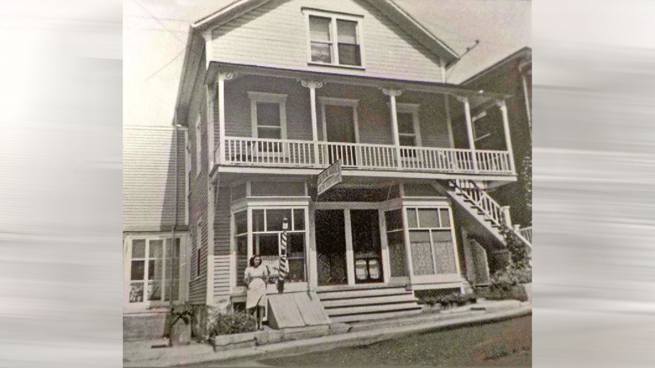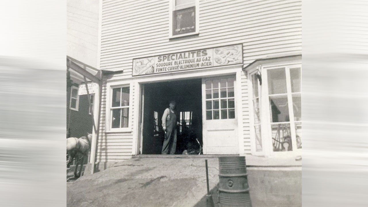 Comme il avait souvent à effectuer des travaux connexes sur des objets en métal, il est aussi devenu soudeur. Aux environs des années 30, il s’est installé dans une bâtisse située sur la rue Saint-Antoine (120e Rue), juste à côté de la pharmacie Poliquin et en face de la ferronnerie Poulin et Grondin. Sa résidence était au second étage et il avait son atelier de forge et de soudure au premier, dans la partie gauche de l’immeuble (photo 2). Il y exerça son métier pendant plusieurs décennies. Ayant couramment à manoeuvrer et travailler de grosses pièces en métal parfois rougies par le feu, à coups de masse, il fut peut-être victime d’une étincelle ou d’une parcelle de métal violemment projetée au visage, car il avait une prothèse oculaire, communément appelée un oeil de verre. On le voit à la porte de son atelier vers 1941 (photo 3). Il a longtemps loué la partie droite du rez-de-chaussée comme salon de coiffure, notamment au barbier Eugène Couture, dont on voit l’affiche à la photo 4. À une certaine époque, il utilisait pour ses déplacements un gros pick-up de marque Dodge ou Fargo «power wagon» qu’il avait acquis du surplus de l’armée. Lorsqu’il se retira, c’est son gendre Henri Paquet qui acheta son commerce. Albert est décédé le 18 mai 1974 et repose au cimetière l’Assomption en compagnie de sa première épouse Mary Thibodeau. Vers 1985-90, son ancienne maison fut transformée en bloc à appartements. Hélas, cet édifice fut complètement détruit par un incendie survenu le 8 avril 2014. C’est aujourd’hui un terrain vacant servant de stationnement.