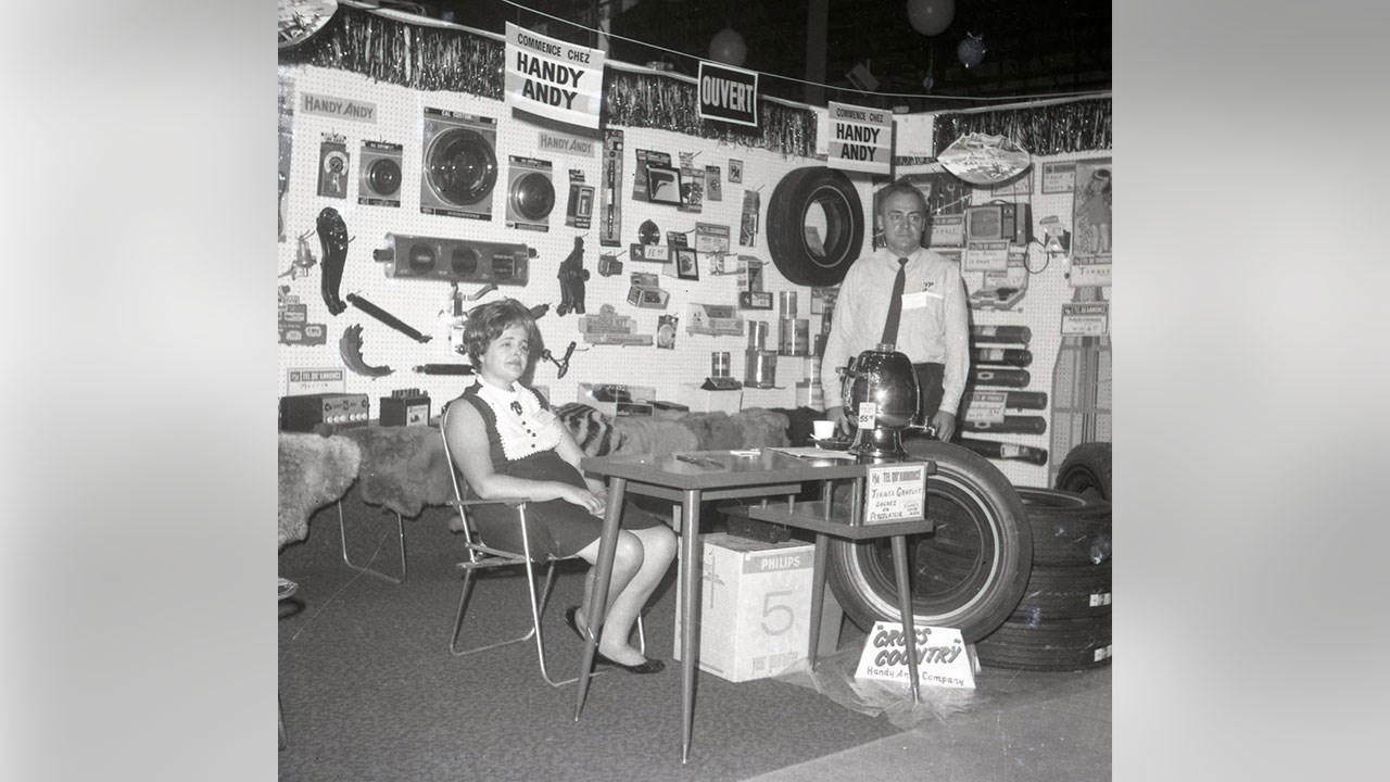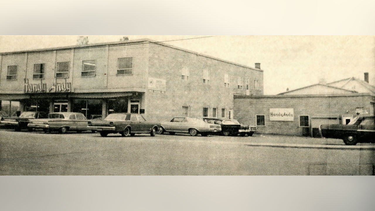 Vous l'avez connu ou vous en avez entendu parler. Ce fameux magasin Handy Andy sur le boulevard Dionne fut autrefois très populaire. Handy Andy Co Ltd était une chaine de magasins fondée en Ontario à la fin des années '40 et qui a connu une expansion fulgurante, notamment au Québec et dans les Maritimes. Ils ont détenu jusqu'à 121 succursales au cours des années '60. À cette époque, ils étaient un commerce un peu du genre des Canadian Tire, mais plus petit que celui que nous avons aujourd'hui à Saint-Georges. Ils vendaient le même genre de marchandise: une grande variété d'outillage pour les menuisiers, les mécaniciens et le jardinage. Des jouets, des articles de sport et de décoration, des appareils électriques et surtout des pneus et pièces d'automobiles. À Saint-Georges, ce sont Bertrand Bolduc et Paul-Eusèbe Poulin qui ont ouvert ce magasin en 1956. Leur premier établissement était au coin de la rue Saint-Gabriel (14e rue) et du boulevard Dionne, dans le même édifice que la brasserie Dow. Ils avaient le local en avant tandis que Dow était sur le côté sud, plus vers l'arrière (photo 1). Ce gros immeuble, qui appartenait à Armand Roy «Mazor», comprenait aussi sept logements résidentiels au deuxième étage. Ce bâtiment fut complètement détruit par un incendie le 21 février 1975. On y a reconstruit un immeuble commercial qui loge aujourd'hui le restaurant Baril Grill.