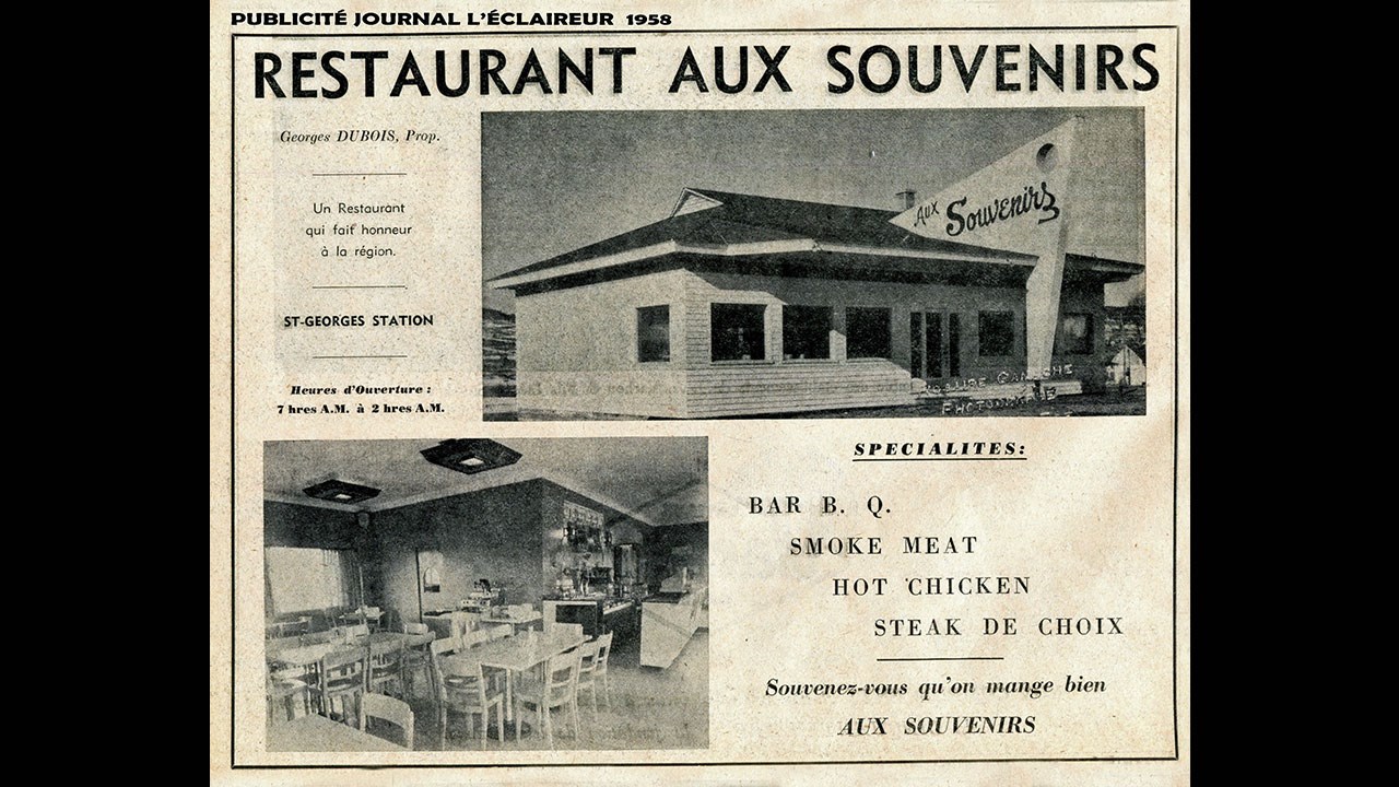 Le 4 avril 1957, M. André Godbout ouvrit le restaurant Aux Souvenirs, adjacent au Motel Souvenir de M. Henri-Louis Larochelle. Ce restaurant était voisin du côté nord des Motels. Ceux-ci étaient situés sur la «route 23» (route nationale, maintenant la 173) dans le secteur de la Station, les motels là où se trouve aujourd'hui le Garage Honda. Et le restaurant Aux Souvenirs là où est maintenant situé le restaurant Normandin. Le restaurant Aux Souvenirs a aussi appartenu à M. Georges Dubois qui adopta le slogan «Souvenez-vous qu'on mange bien AUX SOUVENIRS». Les deux premières photos sont de 1958. La première nous donne un aperçu de l'aspect extérieur du bâtiment et la 2e nous fait voir la salle à manger telle qu'elle était à la même époque. Voyez une de leurs publicités parue dans le journal l'Éclaireur encore en 1958 (photo 3).
