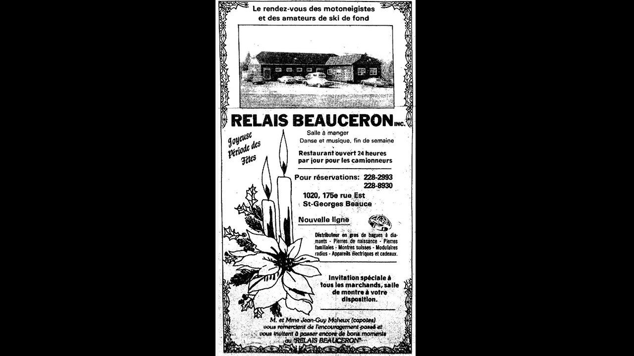 Comme les affaires allaient bien ici, il a décidé de déménager son établissement de St-Zacharie à Saint-Georges. C'est la firme de Viateur Lachance de St-Évariste qui effectua le déménagement en passant par le rang St-Charles pour arriver dans le «rang des Carreaux» aujourd'hui connu comme étant la 175e rue (photo 1). M. Maheux installa sa propriété au coin sud-est de l'intersection de la 10e avenue. Le nom officiel était le «Relais Beauceron» comme on le constate à une publicité parue dans le journal L'Éclaireur-Progrès de décembre 1980, mais tout le monde l'appelait Maheux les capotes (photo 3). Pendant quelques années, il y exploita un bar-restaurant qui fut très populaire; en hiver il accueillait les motoneigistes.
