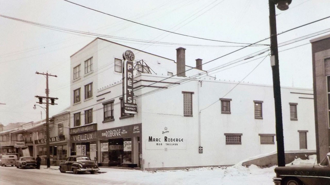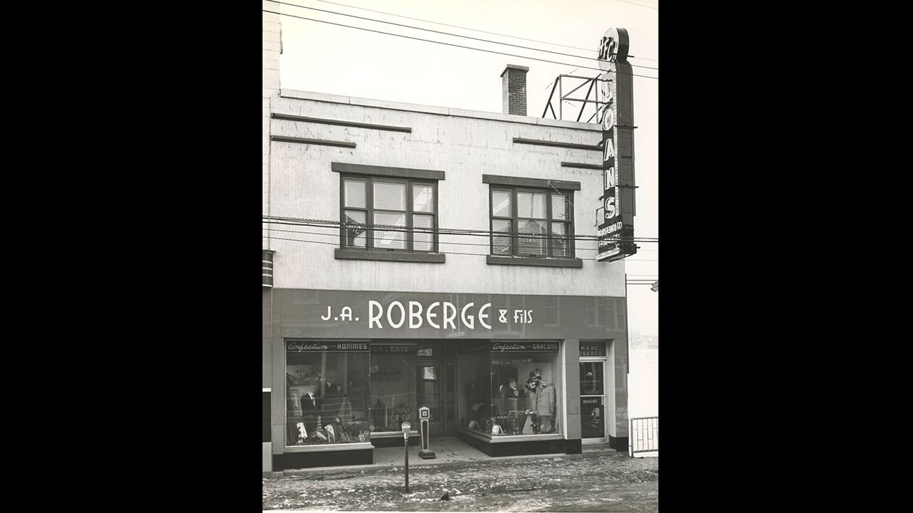 À l'époque de la 1re photo, son voisin de droite était la mercerie Marc Roberge mon Tailleur, qui était situé tout juste à côté du ruisseau d'Ardoise. Il exploitait une mercerie pour hommes. Ce site a longtemps été occupé par des commerces de vêtements pour hommes. Construit en 1945, ce fut d'abord J.A. Roberge qui démarra un tel magasin en 1945 (photos 3 et 4). Examinez bien la 4e photo, on y voit un pèse-personne (qu'on appelle aussi une «balance») qui était situé près du trottoir, devant l'entrée, Il fallait insérer une pièce d'une cenne dans la fente prévue à cet effet pour activer le mécanisme permettant de se peser. Elle fut longtemps à cet endroit, même après que son fils eût pris la relève, je m'y pesais occasionnellement quand je passais à cet endroit dans les années '60. Son fils Marc prit la relève vers 1960, tel qu'on le voit à la photo 5, prise à l'hiver 1961-62. La compagnie Household Finance (HFC) eut longtemps ses bureaux au 2e étage de cet édifice et y installa son énorme enseigne lumineuse en 1955.