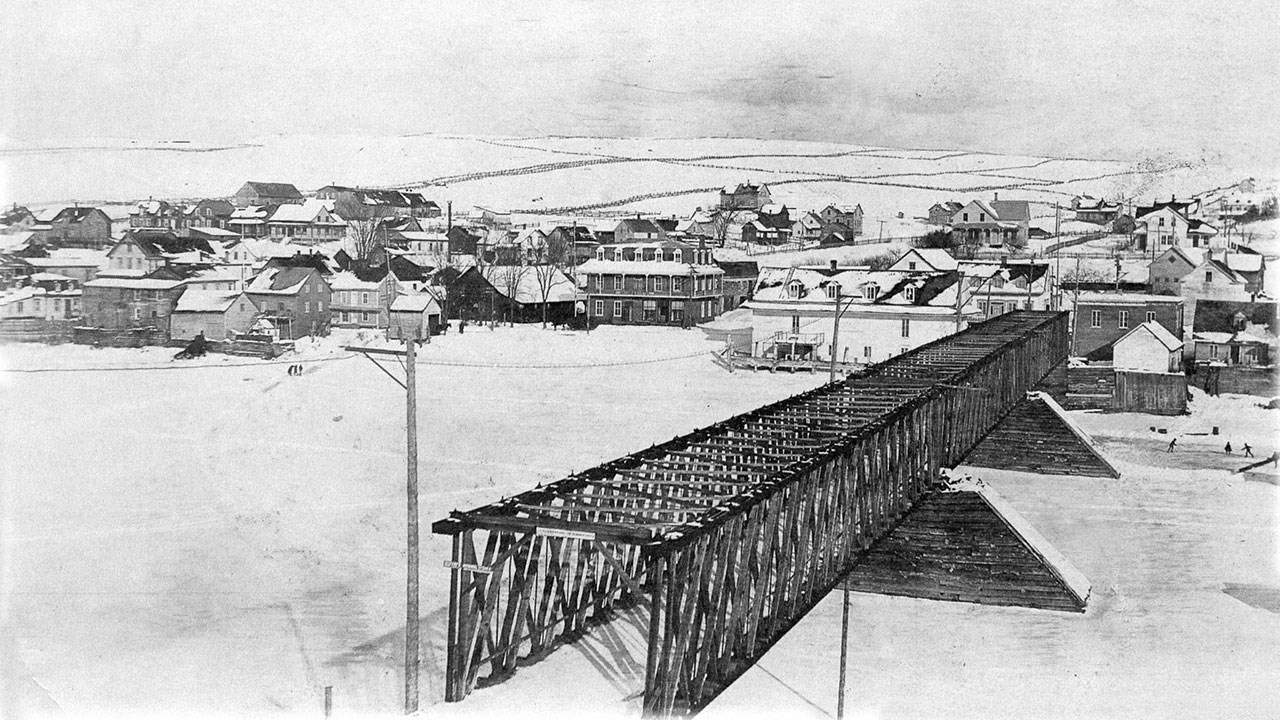 Nous avons la chance d'avoir une photo exceptionnelle prise au cours de l'hiver 1909, nous montrant le premier pont que nous avons eu à Saint-Georges, un pont en bois érigé par M. David Roy (photo 3). Il s'agissait d'un pont payant. Les usagers devaient défrayer le prix à chaque passage, à la sortie du pont, du côté est, dont le poste de perception était adjacent à la résidence même du propriétaire, soit celle de forme carrée qui se trouve juste à droite de la sortie du côté est, et qui existe encore aujourd'hui (appartenant au notaire Benoit Maheu face à la 123e rue). Or, en hiver plusieurs piétons utilisaient plutôt un petit sentier sur la glace (que l'on peut apercevoir à gauche du pont, où 3 personnes semblent jaser près de la rive) pour éviter d'avoir à débourser le droit de passage exigé par le propriétaire du pont. Des petits futés en somme, David devait fulminer de rage...