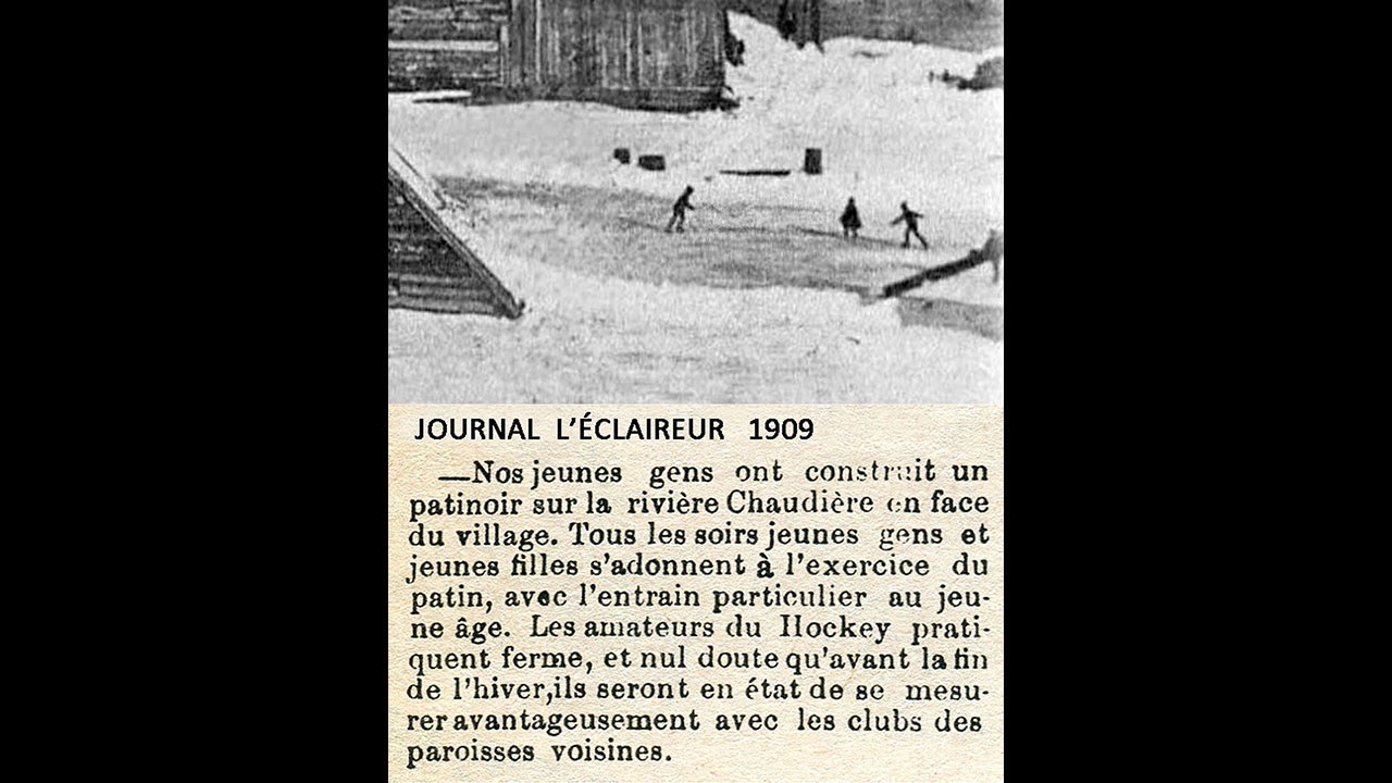 Et à droite du pont, on a déneigé un espace pour former un genre de patinoire sur la rivière, où on voit des jeunes en train de patiner. J'ai agrandi cette section à la 4e photo pour mieux distinguer cette image nostalgique nous renvoyant plus de 100 ans en arrière. J'y ai annexé un court article a paru dans le journal l'Éclaireur en 1909, soulignant l'aménagement de cette patinoire (qu'on appelait alors «un patinoir») directement sur le couvert gelé de la rivière. Wow, des images extraordinaires de nos ascendants dans leurs activités journalières.