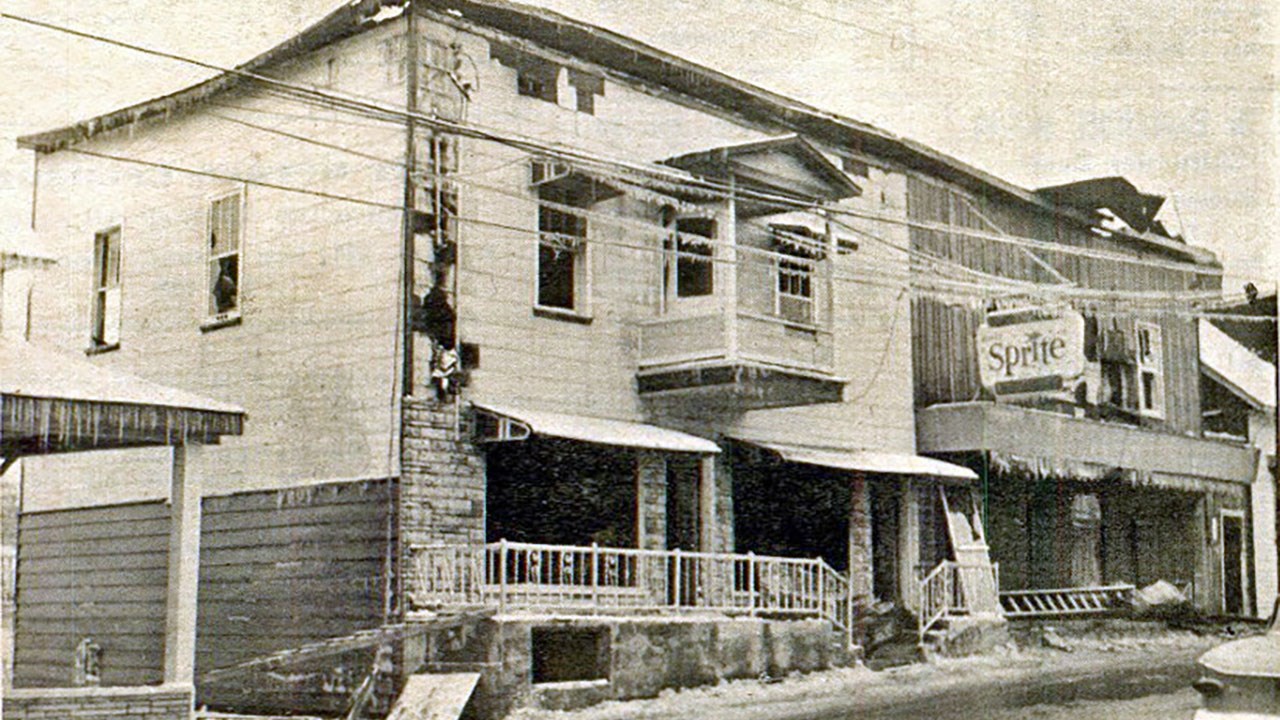 Hélas, dans la soirée du samedi 20 novembre 1965, le feu éclata dans cet édifice (photos 1 et 2). Les flammes ont pris dans le sous-sol vers 8h30. Les pompiers ont travaillé pendant quatorze heures pour maitriser l'incendie. Cet immeuble, en plus d'accueillir l'épicerie, comprenait aussi le logement de Laurent Veilleux ainsi que les logements de son frère Hector Veilleux et de Nelson Drouin. M. Veilleux et sa famille ont dû évacuer d'urgence la bâtisse et il leur fut impossible de sauver quoi que ce soit de leur mobilier ou de leurs vêtements. Il en fut de même pour les familles d'Hector Veilleux et de Nelson Drouin.
