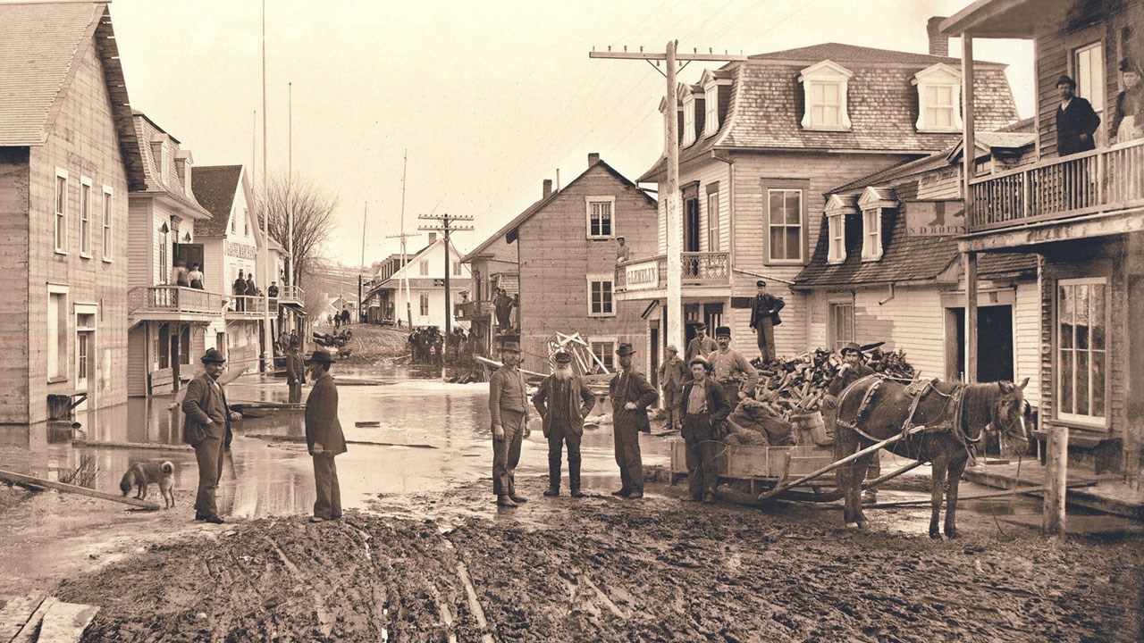 On sait que la ville de Saint-Georges a été victime de nombreuses inondations au cours de son histoire, la pire ayant été celle de 1896. Ce fut une catastrophe terrible pour nos ancêtres. Des scènes apocalyptiques se sont produites à cette occasion. Le renommé photographe J.A. Gagnon a su capter sur pellicule le désarroi alors vécu par ses concitoyens. La scène la plus désolante est probablement celle illustrée à la première photo. Cette pauvre dame, épouse du cordonnier Napoléon Drouin, est assise au pied des débris de leur résidence qui a été détachée de ses fondations et déplacée, tout croche, au centre de la rue, parmi les autres immeubles empilées pêle-mêle au centre-ville. Même si on ne distingue pas clairement les traits de son visage, on réalise qu'il s'agit d'une dame fière et élégante, avec ce qui semble être son veston replié sur ses genoux. On voit à droite une chaise en bois et un peu plus loin une table au milieu des débris. Les gens essayaient de récupérer tout ce qu'ils pouvaient, car la majorité ne détenaient aucune assurance et se voyaient contraints de repartir à zéro et de se refaire une vie. Quelle désolation, quelle misère.