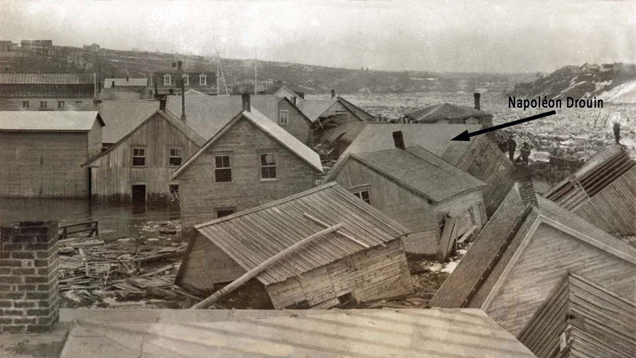 Quant à la maison de Napoléon et Félixine en 1896, on a la chance d'en avoir une photo prise peu de temps avant sa destruction (photo 2); c'est celle à l'extrême droite, où on aperçoit le couple sur la galerie du 2e étage. On en possède une autre (photo 3) prise dans les jours suivant la débâcle, on voit la toiture de leur maison, c'est celle indiquée par une flèche, obstruant la rue de ce qui était alors le centre-ville. Wow, nos ancêtres ne l'ont pas eu facile. Que de courage et de persévérance ils ont dû faire preuve pour passer à travers de telles épreuves. Ils méritent notre plus grand respect.
