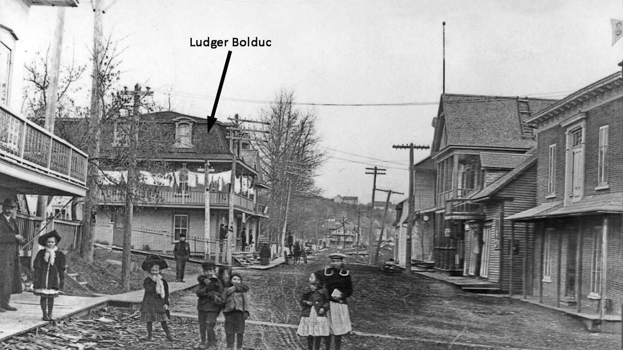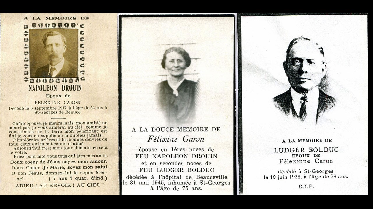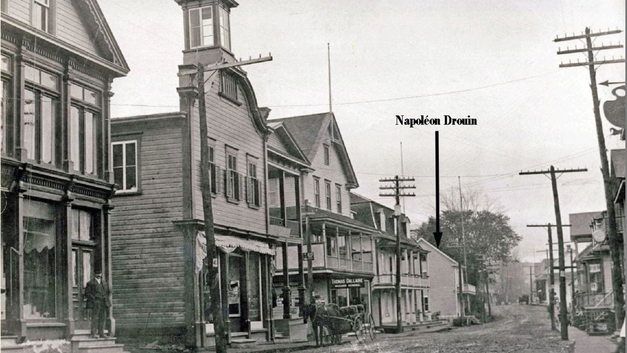 Je trouvais malheureux qu'on n'en sache pas plus sur cette femme qui semble bien seule sur cette photo. Qui est-elle et qu'est-elle devenue? Elle méritait qu'on en apprenne davantage sur son histoire. Mon bon ami Paulin Poirier m'a aidé dans cette tâche. Son nom est Félixine Caron, originaire de Beauceville, née en 1870. Elle s'est mariée en 1888. Son mari Napoléon Drouin avait acheté leur résidence en 1887 de Joseph Lessard (frère de Thomas Lessard). Ils s'y installèrent immédiatement après leur mariage, en 1888. Après sa destruction par la débâcle de 1896, ils se relocalisèrent un peu plus au sud, dans une maison qu'on voit à la 4e photo, indiquée par une flèche. Ils ont cédé celle-ci plus tard, le 2 mars 1914, à Pierre (dit Pierrot) Fortin qui l'a revendue en 1920 à la banque Royale qui l'a démolie pour y ériger son nouvel édifice. Cette banque (rénovée) est encore sur ce site. Napoléon Drouin étant décédé en 1917, Félixine s'est remariée le 2 août 1920 à un autre cordonnier, Ludger Bolduc. Le couple a vécu dans un gros immeuble située au coin de la 123e rue, qu'on voit à la photo 5 (plus tard site du magasin Davis). Ludger est décédé le 10 juin 1938 à l'âge de 78 ans. Félixine s'est éteinte le 31 mai 1945 à l'âge de 75 ans (elle n'a pas eu d'enfants). Voyez leurs cartes mortuaires (photo 6).