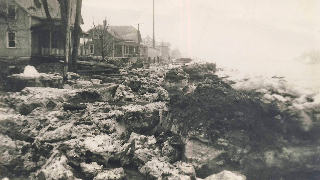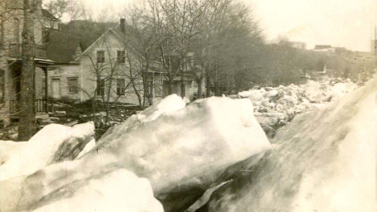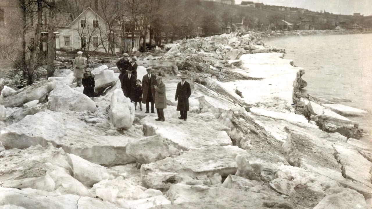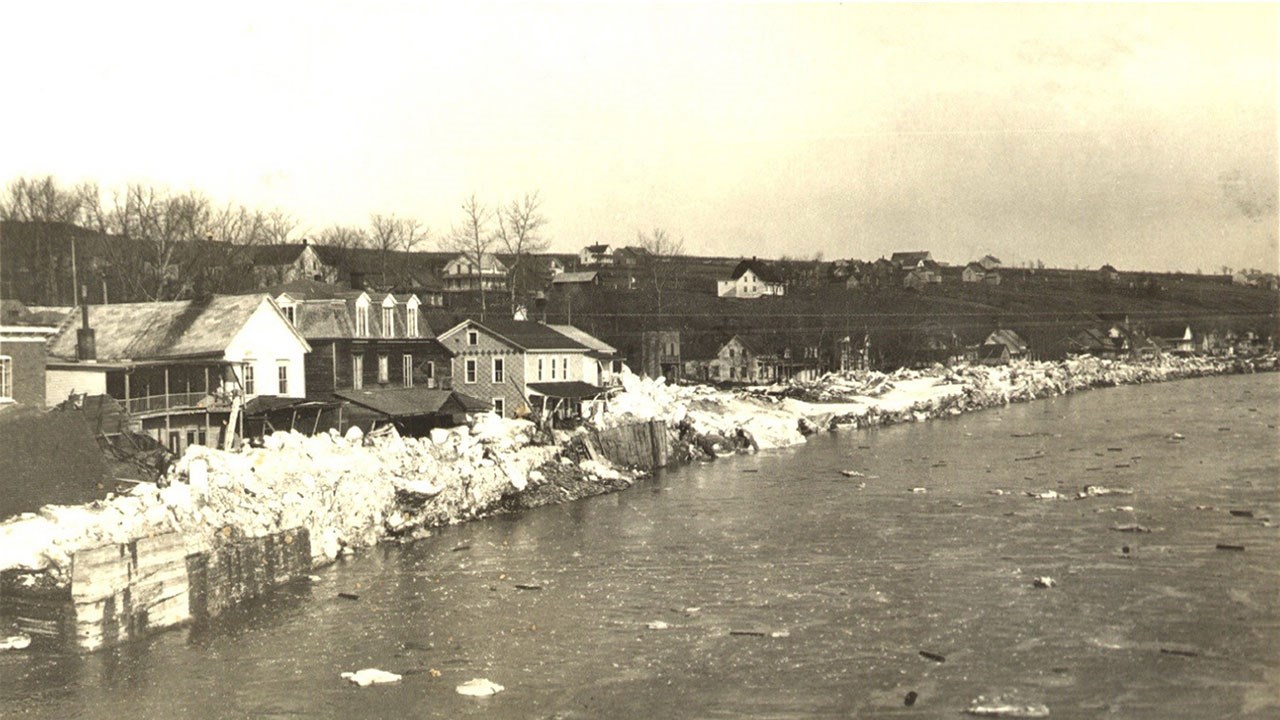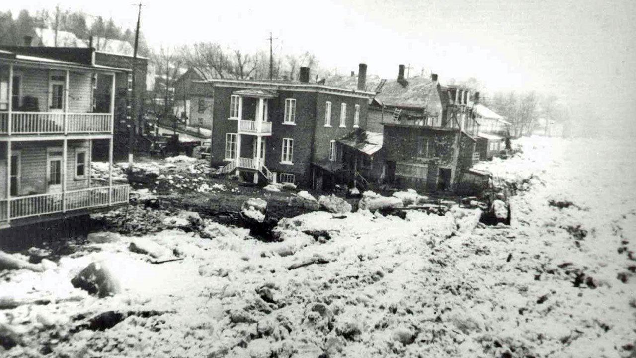 La 1re photo, qui est extraordinaire, fut prise peu de temps après la pire débâcle de notre histoire, celle de 1896. Le moulin Morency (à gauche sur la photo) et les édifices environnants ont subi d'énormes dommages. Les débris se sont accumulés un peu partout dans le secteur. On voit les gens désemparés devant s'occuper de nettoyer cette scène de catastrophe. Celle de 1913 fut aussi impressionnante (photo 2). La 3e photo a été prise à peu près au même endroit suite à la débâcle de 1914. Les glaces ont monté si haut qu'on ne voit plus que la grande cheminée du moulin Morency au centre de la photo. La situation ne fut pas mieux l'année suivante, en 1915. Voyez le magasin général de Frédéric «Freddy» Loubier devant lequel les glaces se sont encore accumulées en plein dans la rue (photo 4). À noter que ce commerce fut entièrement détruit par un incendie en 1927.