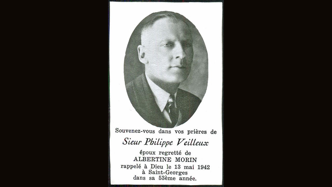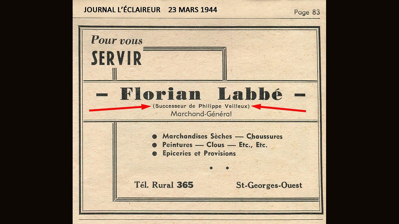 Il y avait à l'époque dans l'Ouest deux personnages importants portant le même nom. Il y eut Philippe Veilleux agent d'assurance (1886-1961), qui fut le premier maire du Village de Saint-Georges-Ouest du 1 janvier 1943 à novembre 1945. Il est décédé le 23 décembre 1961 à l'âge de 75 ans. Et il y avait l'autre, celui qui a créé le magasin général qu'on voit sur la 1re photo, Philippe Veilleux à Octave, huitième d'une famille de 14 enfants. Il est né le 29 août 1889 et est décédé le 13 mai 1942 (sa carte mortuaire à la photo 3). Son épouse était Mme Albertine Morin (la tante de mon père, il l'appelait «tante Bertine»). Ils n'eurent pas d'enfant.