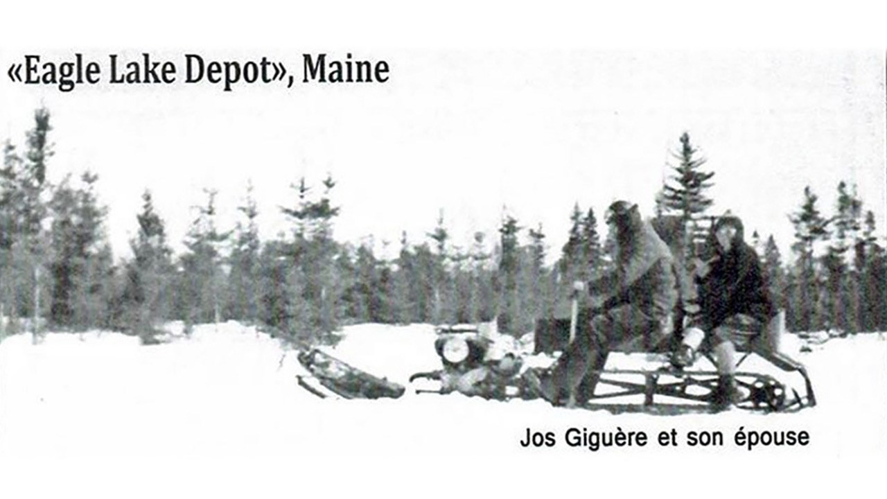 La 2e photo est aussi intéressante, on y voit Jos Giguère et son épouse circuler sur une motoneige de fabrication domestique dans le secteur du Eagle Lake Depot. Ce toboggan fut entièrement fabriqué par les «patenteux» Giguère et son collègue de travail Émile Labbé pendant les rares moments de loisir que leur procurait leur travail dans les chantiers forestiers dans le Maine au siècle dernier, plus particulièrement dans les années '20, '30 et '40. Ils étaient deux hommes clés d'Édouard Lacoix et devaient trouver le tour de régler tous les problèmes techniques qui pouvaient se présenter. Ils étaient de vrais génies de la mécanique et ont accompli de véritables miracles dans des circonstances pas toujours faciles. Ce véhicule est exposé à Patten (Maine) au «Lumberman's Museum».
