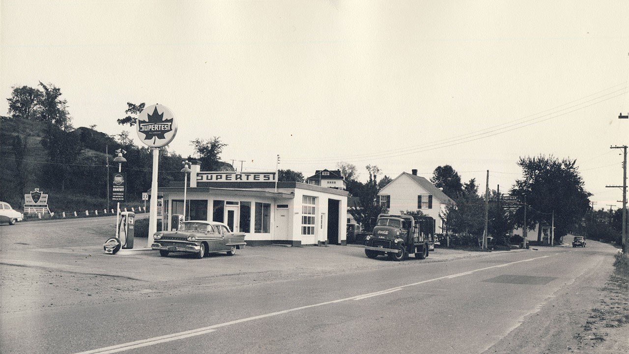 Le parfait modèle de la station service d'il y a 60 ans: en plus de vendre de l'essence, il offrait le service et faisait la mécanique. C'était avant l'ère des dépanneurs libres-services. C'est M. Laurent Gagnon (né à Saint-Côme en 1934) qui l'a fondé. Celui-ci a suivi des cours spécialisés en mécanique à l'École Technique de Québec pendant 3 ans, de 1952 à 1955. En juin 1956, il a ouvert ce garage sous la bannière de SUPERTEST. Ce commerce était situé au bout (nord) de la 2e avenue, à la jonction du boulevard Lacroix. La 1re photo daterait probablement de 1958. En plus de l'essence, on y vendait et installait des pneus de marque Dunlop, comme c'est indiqué sur une pancarte au-dessus des pompes. Une autre affiche mentionne qu'on y faisait le graissage, le lavage et le «simoniz» des autos. Il semble que l'automobile devant les pompes serait un Oldsmobile 1958. Et le camion, un modèle 1954 peut-être? Plus tard, entre 1965 et 1971, c'est Claude Groleau qui a opéré cette station-service; il y vendait entre autres des motoneiges Snow-Prince.