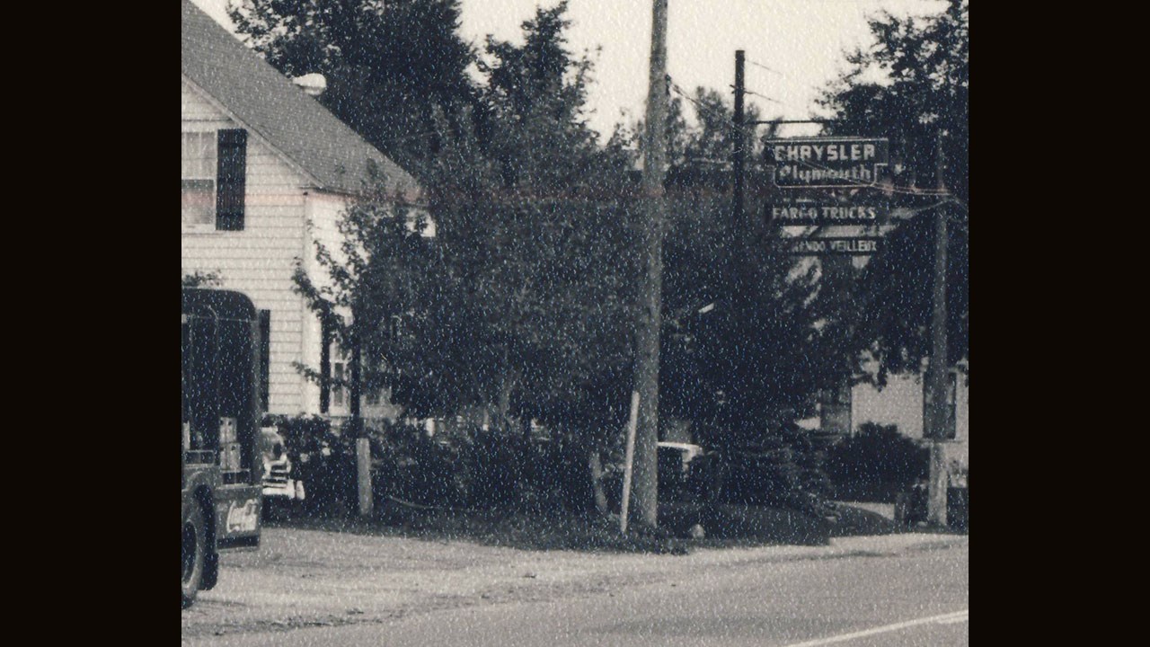 La 2e photo, nous montrant les mêmes lieux que la première, aurait été prise quelque temps plus tard, à en juger par la grosseur de la végétation, comparé à la 1re photo. À droite de la photo on voit une partie de la maison et de la cour du garage de Fernando Veilleux. On a de la difficulté à discerner exactement ce qui est écrit sur l'affiche près des arbres. J'ai donc agrandi cette partie de la photo afin de découvrir le texte exact de cette pancarte (photo 3). On y lit: «CHRYSLER PLYMOUTH FARGO TRUCKS» et au bas: le nom du propriétaire «FERNANDO VEILLEUX». C'est en novembre 1955 qu'il a installé son commerce de vente d'autos à cette adresse et en 1959 qu'il a construit ce garage. Saviez-vous qu'en 1968, il comptait les deux excellents vendeurs Valère Champagne et Bertrand Sirois. Cette résidence, dont le numéro de porte était le 10945 de la 2e avenue, fut plus tard transformée en édifice commercial qui a abrité dans les années 2010 l'Institut de beauté Terra Nova. Cette bâtisse fut démolie dans la journée du 2 octobre 2018 pour faire place à un stationnement pour l'immeuble à bureau qui occupe l'ancien espace voisin, face au terrain de baseball du centre sportif.