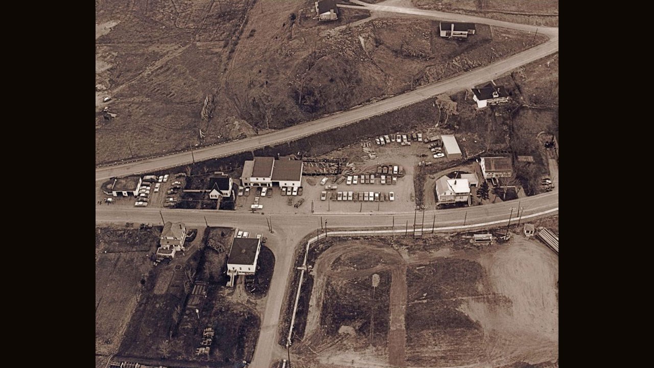 Et une spectaculaire vue aérienne des lieux quelques temps plus tard, vers 1965-67 (photo 4). On voit beaucoup mieux les installations du commerce d'autos de Fernando Veilleux et on réalise qu'il offrait une grande quantité de véhicules. Incroyable de réaliser à quel point ce secteur a changé et s'est développé. On constate que la configuration de l'intersection était alors complètement différente de ce qu'elle est aujourd'hui. D'abord, le boulevard Lacroix n'était à cette époque qu'à deux voies (au lieu de quatre voies aujourd'hui). De plus, ceux qui sortaient de la 2e avenue pouvaient alors s'engager sur le boulevard Lacroix soit vers le sud soit vers le nord, ce qui est maintenant impossible puisque la seule alternative est de tourner vers le sud (voir la photo 5 de 2009). De plus on réalise que l'aménagement du terrain de jeu en arrière de l'OTJ n'était pas encore complété.