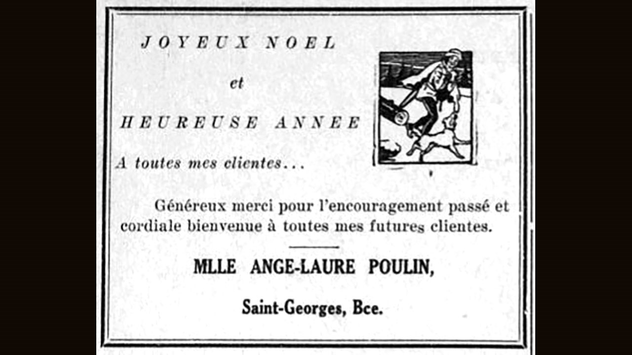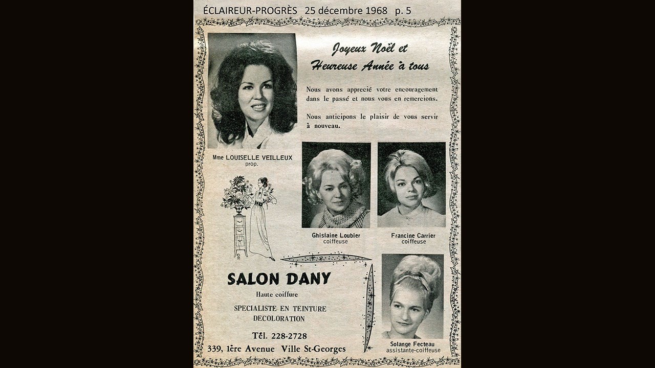 Il semble que la première coiffeuse qu'on a connue à Saint-Georges était Mme Ange-Laure Poulin (photo 2 de 1935). Née en 1900, elle a commencé jeune, dans la résidence de son père Georges dont la maison était au 135 de la 125e rue, où elle a longtemps eu son salon (jusqu'en 1962, puis ailleurs ensuite). Déjà dans les années '40, elle avait des employées et elle participait à des congrès de coiffure à Montréal. Elle annonçait qu'elle faisait des permanentes, des ondulations et des coiffures de tous genres. Elle est décédée en 1978 (photo 3).