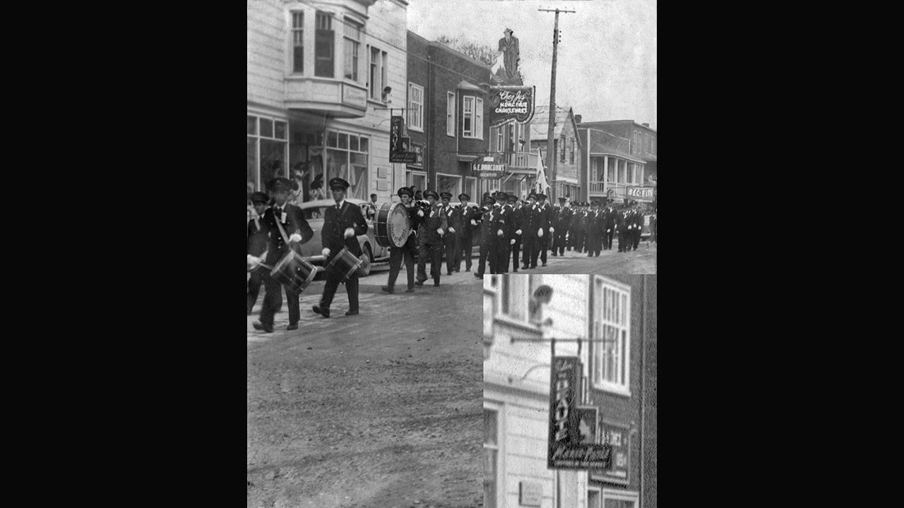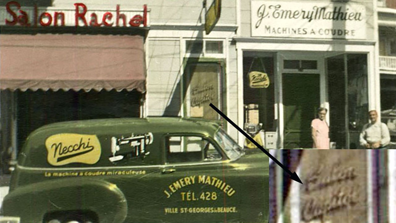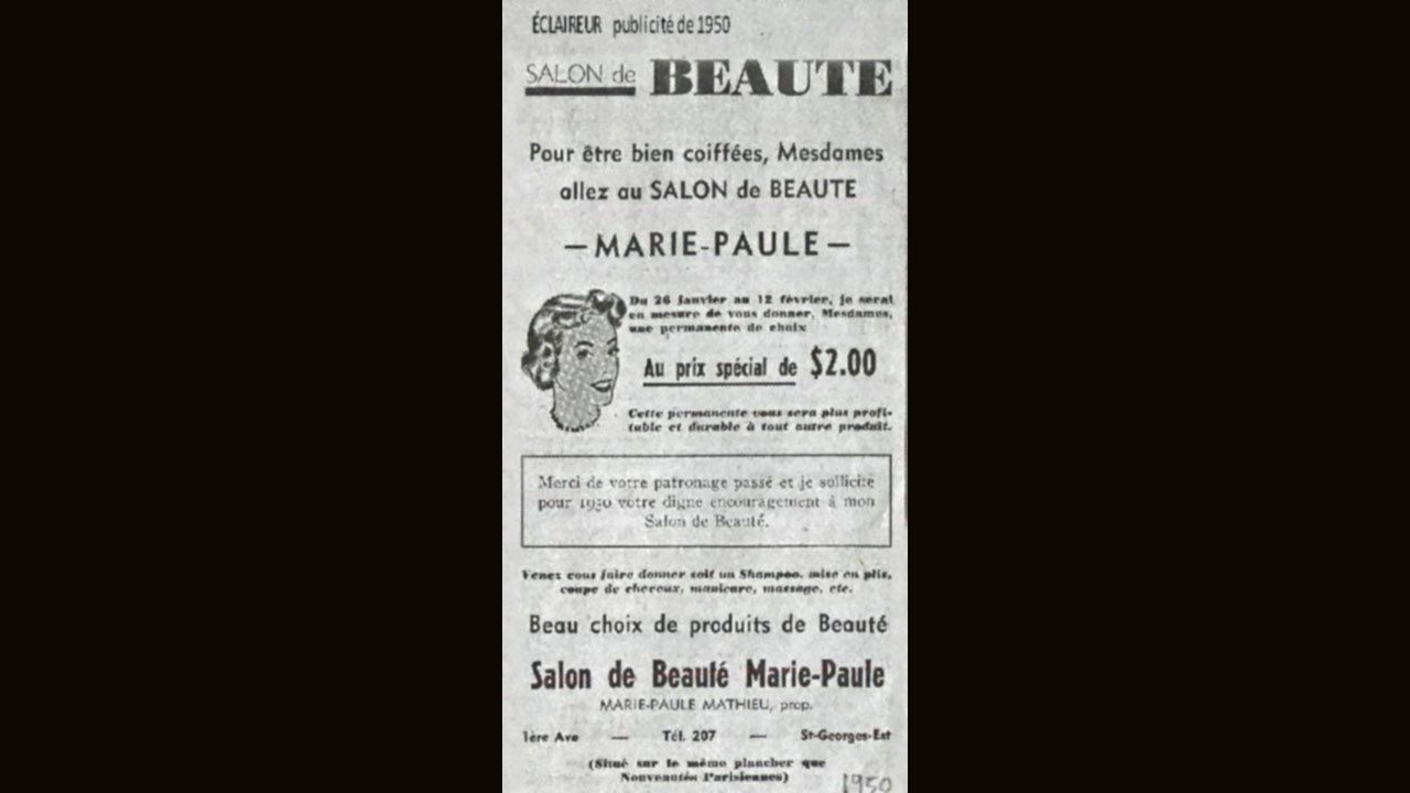 La 6e photo (de novembre 1946) nous montre l'affiche du Salon de Beauté Marie-Paule (Marie-Paule Mathieu) qui était sur la 1re avenue dans le même immeuble que Nouveautés Parisiennes (aujourd'hui c'est le Rock Café qui est à cet endroit). Dans une publicité de 1950, elle annonçait une permanente à 2$ (photo 7).