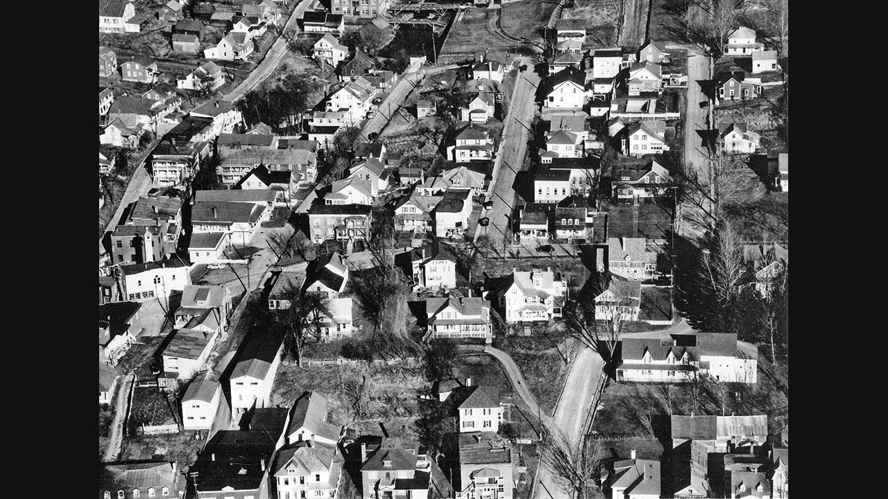 La 1re photo fut prise le 19 janvier 1944. Les personnes à l'avant-plan sont trois fils de Josaphat Poulin: de gauche à droite Gilles, Richard et Jean. Cette impressionnante maison était située dans la rue St-Georges (123e rue), que certains appelaient autrefois «la rue à Josaphat», car tout le monde savait qui était propriétaire de cette grosse bâtisse, M. Josaphat Poulin, surtout qu'il fut maire de notre ville pendant un total de 12 ans, dans les années '30, '40 et '50. C'était une grande résidence au toit et volets verts. Lui et son épouse sont allés y habiter peu de temps après leur mariage qui a eu lieu en 1927 et y ont élevé leur famille de six enfants.