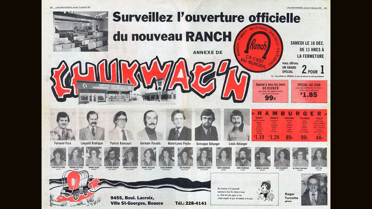 On a ouvert à Saint-Georges en décembre 1978 sur le boulevard Lacroix, le premier commerce à la sortie nord du pont de la Famine dans le secteur de la Station (photo 2), il était voisin du lave-auto d'Alain et Jacques Poulin, les fils de Luc Poulin. Comme le succès fut au-delà de ce qu'on avait anticipé au départ, on a vite agrandi pour être en mesure d'accueillir la clientèle importante (photo 1). On constate facilement que c'est le même immeuble qui a été agrandi par la gauche et on en a profité pour améliorer l'apparence de l'édifice, style far-west. Remarquez qu'il y avait deux enseignes à l'avant de ce commerce, celle de gauche annonçait le restaurant le RANCH, tandis que celle de droite indiquait le nom du CHUCKW'GON. Probablement que les clients pouvaient l'appeler indistinctement de l'un ou l'autre de ces deux noms, c'était le même restaurant de toute façon. Même chose sur leur publicité qui a paru dans le journal local en décembre 1978, on y voit aussi les deux noms, celui du Ranch étant encastré dans un fer à cheval. Cette publication annonçait l'ouverture (photo 3).