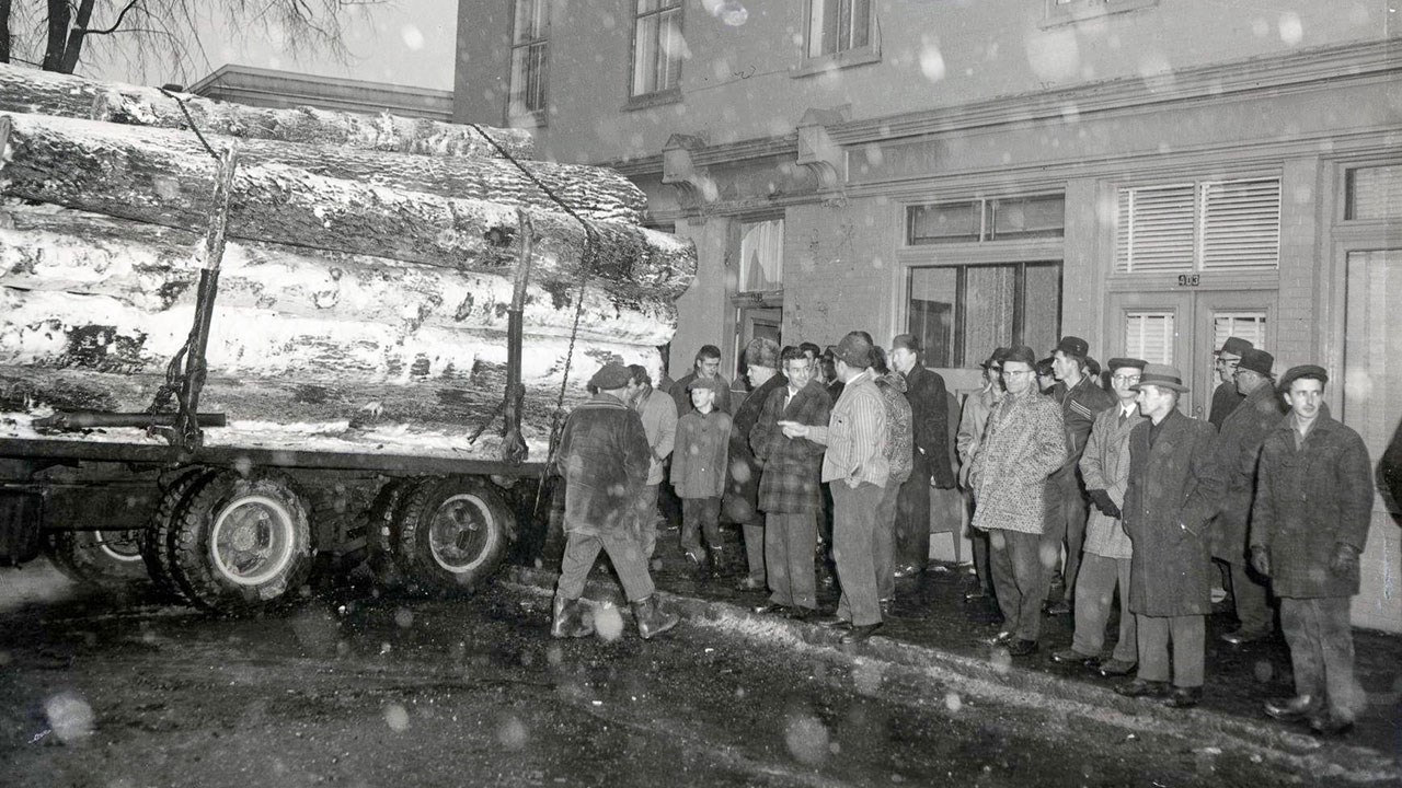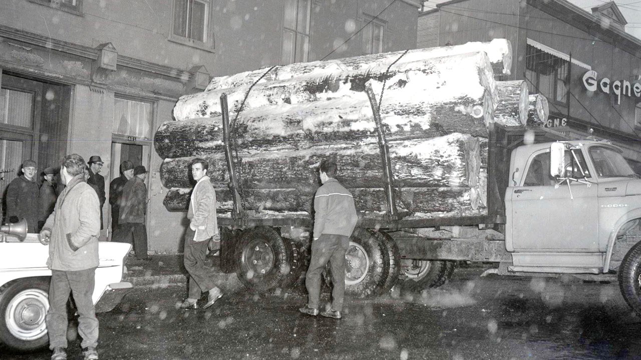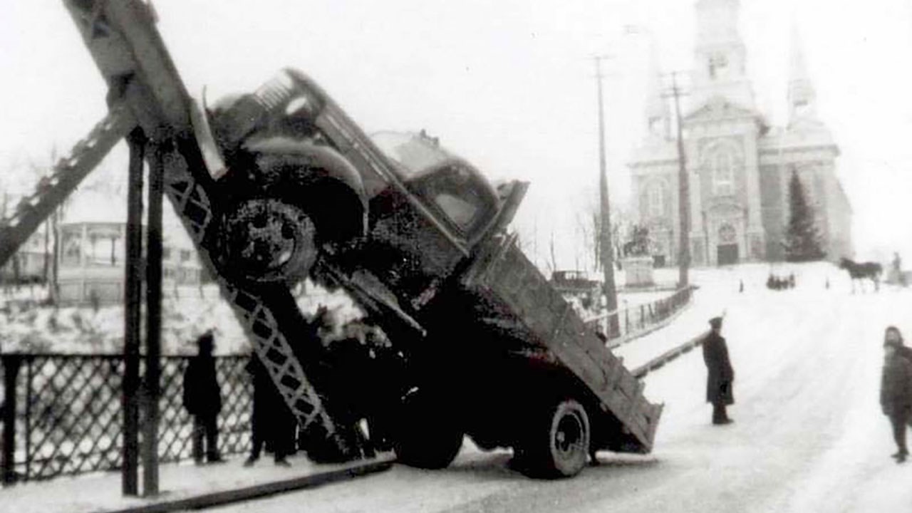 Au cours de l'hiver 1964, en plein vendredi soir, où cette artère était habituellement très achalandée, un camion lourdement chargé de gros billots arrivait au sommet de cette pente maléfique, lorsque la transmission a lâché! Les freins n'y purent rien, il ne restait plus que le contrôle du volant. C'était un camion des Industries Rancourt appartenant à M. Fernand Rancourt, tel qu'il me l'a raconté lui-même. Le conducteur Jean-Marie Therrien a réussi miraculeusement à reculer jusqu'à l'édifice face au pont et s'est arrêté à quelques pouces de la façade de la Banque Canadienne Nationale, tel qu'on le voit aux photos 2 et 3. Si des employés étaient au travail à l'intérieur de la Banque, ils ont dû avoir une frousse terrible en voyant venir le camion, de reculon par surcroît. Wow, un vrai miracle qu'aucun dommage ne soit survenu. Le chauffeur en fut quitte pour une bonne frousse, mais l'histoire de son exploit s'est propagé partout en ville. Ça aurait mérité une médaille.