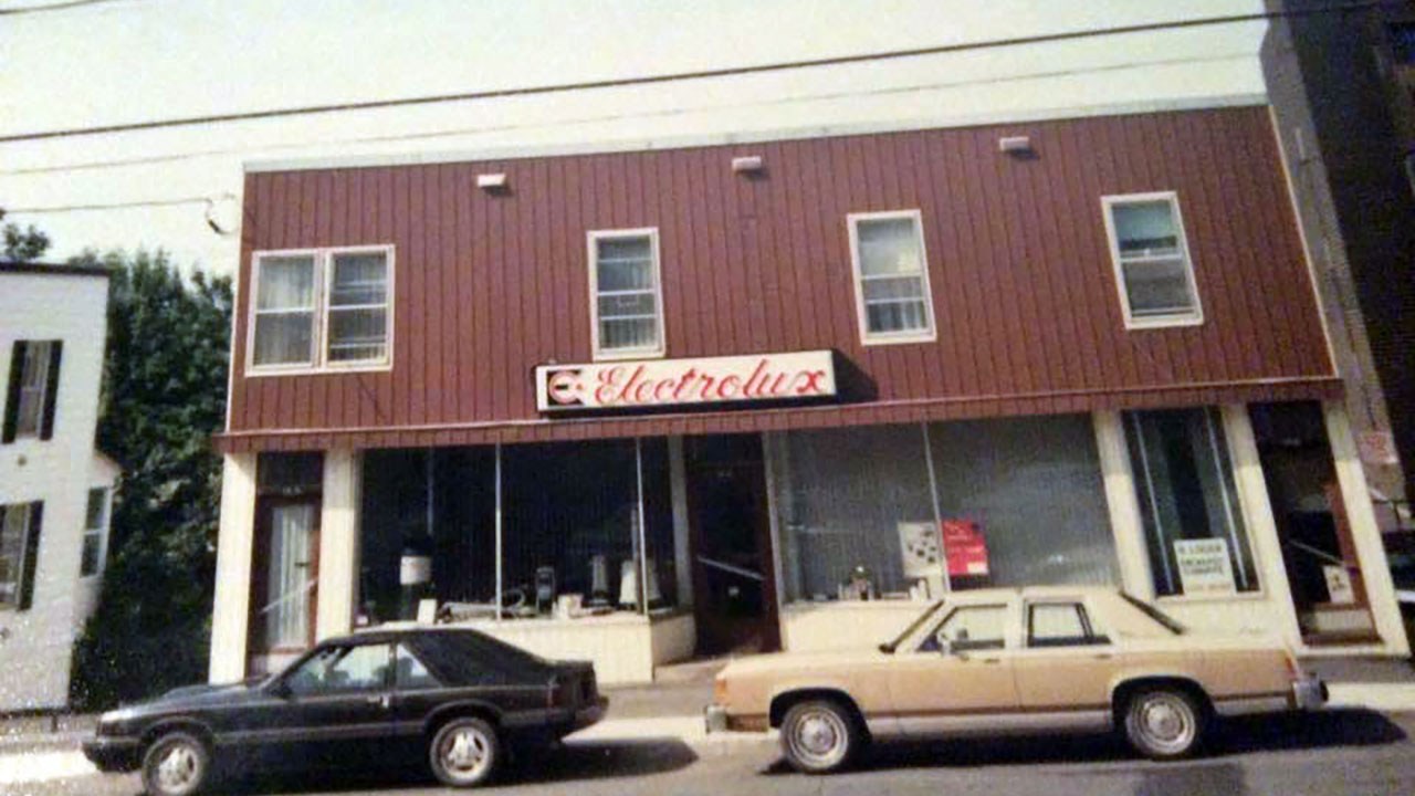 Voyez un autre commerce qui, dans les années '60, a aussi logé pendant un certain temps au même endroit (chez M. Provost, face au Salon de coiffure l'Éden), soit la Régie des Alcools (photo 4, de 1963). La bâtisse de M. Provost fut démolie le 8 juillet 1996, et on y a aménagé un stationnement pour l'édifice Canam-Manac. Et dans l'immeuble voisin (ayant appartenu autrefois au menuisier Jos Lessard), le magasin Électrolux dans les années '80 (photo 5), après quoi ce fut un édifice à logements. La firme Canam-Manac acheta cet immeuble en 1996 et l'a démoli au printemps 1997 pour y agrandir son stationnement.
