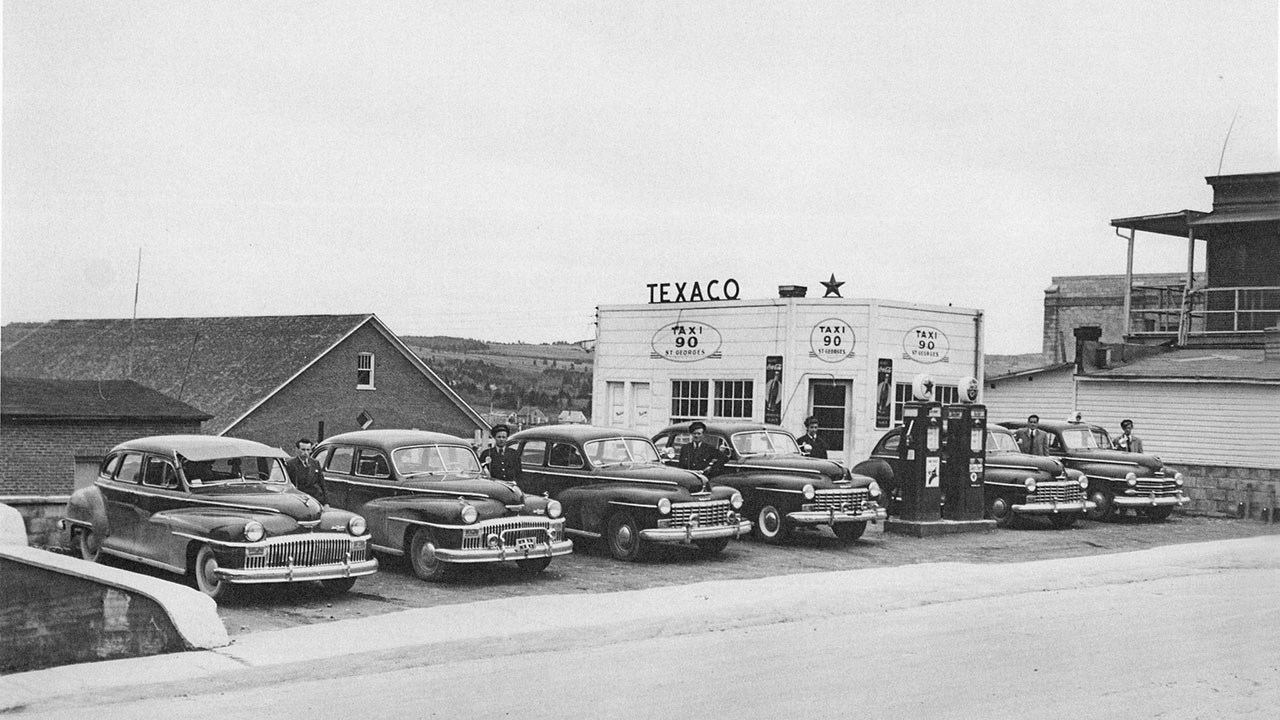 Sur la 2e photo vers 1947, on constate que la bâtisse qui logeait le poste des chauffeurs de taxi 90 était la même que sur la 1re photo. On peut en conclure que le poste de Taxi Royal a probablement changé de nom vers 1946, peu de temps après être déménagé dans le secteur de la 118e rue. Le nom qu'ils ont choisi pour leur nouvelle désignation «Taxi 90» provient du numéro de téléphone qui leur a été attribué, soit le «90». Plus tard, quand on a instauré le système des numéros à sept chiffres en 1961, ils ont fait affaire sous le numéro 228-2090. Il semble aussi que le nombre de taxis disponibles a augmenté beaucoup puisqu'on dénombre six véhicules à la 2e photo. Voici les noms des chauffeurs apparaissant sur cette photo: Odilon Gilbert, Paul Dostie, Luc Poulin, Russel Wintle, Benoit Poulin et Fernand Gilbert. Il y eut aussi à ce poste Dorian Fortin, Vénérand Poulin, Benoit Lessard, Hector Veilleux et Gonzague Rancourt.