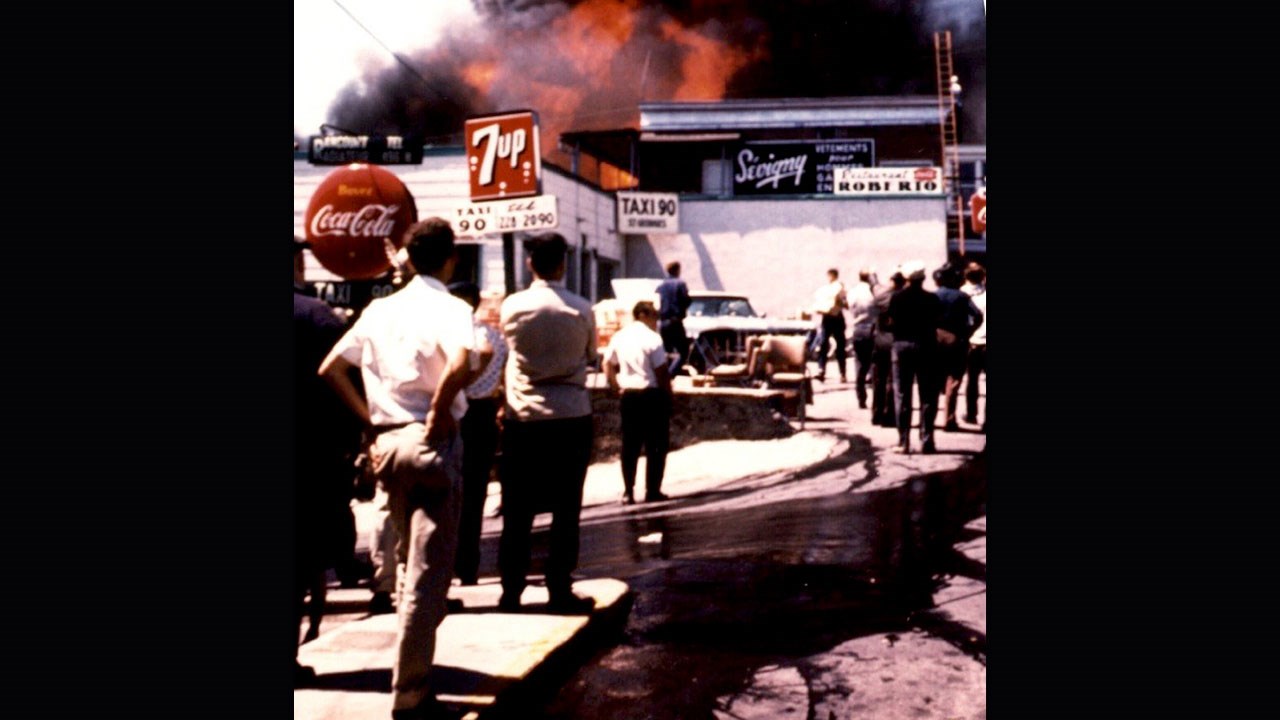 Espérons qu'un ou quelques lecteurs ainés pourront reconnaitre l'un ou l'autre des deux chauffeurs de taxi de la 1re photo. Il y a de grosses chances que ces deux hommes aient été parmi le groupe qui a fondé le poste de taxi 90, qui a longtemps été situé à cet endroit. Dans les années '50, leurs voisins du côté nord étaient le restaurant Luncheonnette et le Magasin Sévigny. Vers 1963, le Luncheonnette est devenu le Roberto, comme on le voit à une photo du gros incendie qui a détruit plusieurs commerces de ce secteur le 16 juillet 1965 (photo 4); on aperçoit l'enseigne du poste de taxi 90 pas très loin de celle du restaurant Roberto.