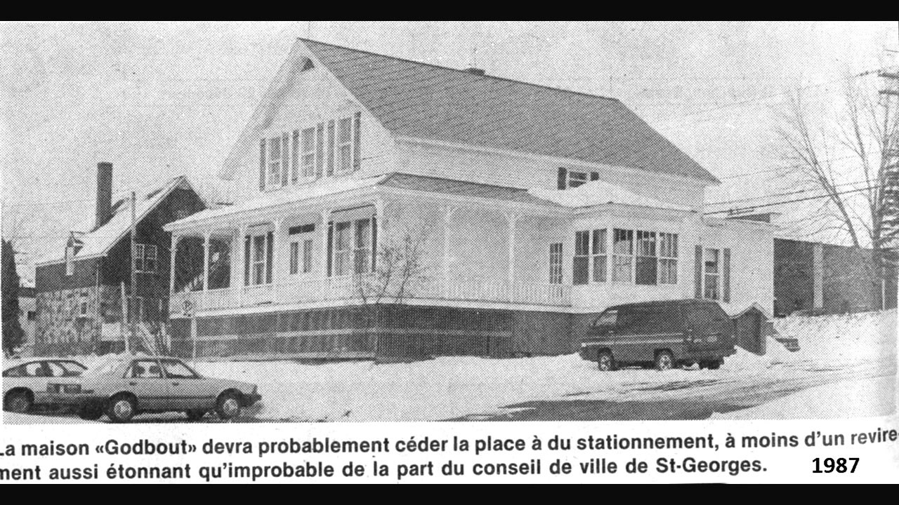 Sa magnifique résidence, un édifice patrimonial, est venue à un cheveu d'être détruite dans les années '80. En effet, les marchands de la 1re avenue, sentant la compétition féroce des centres d'achats, se cotisèrent chacun de 5000$ et prirent entente avec les autorités municipales pour qu'on érige un grand stationnement au centre-ville entre la 123e et la 125e rue, en arrière de la rangée de commerces, ce qui fut fait. La maison Godbout devait disparaitre pour faire place à un stationnement à côté du nouveau qu'on venait d'ériger (photo 4). Le propriétaire de celle-ci refusa de la céder à la ville. Les marchands firent des pressions auprès des élus. Il aurait alors fallu intenter des procédures en expropriation pour l'acquérir en vue de la démolir ou la déménager. Les choses trainèrent en longueur, et finalement on a fini par oublier cette affaire, de sorte que la maison a survécu et est toujours là. Admirez-là la prochaine fois que vous passerez dans le secteur, elle a encore fière allure.