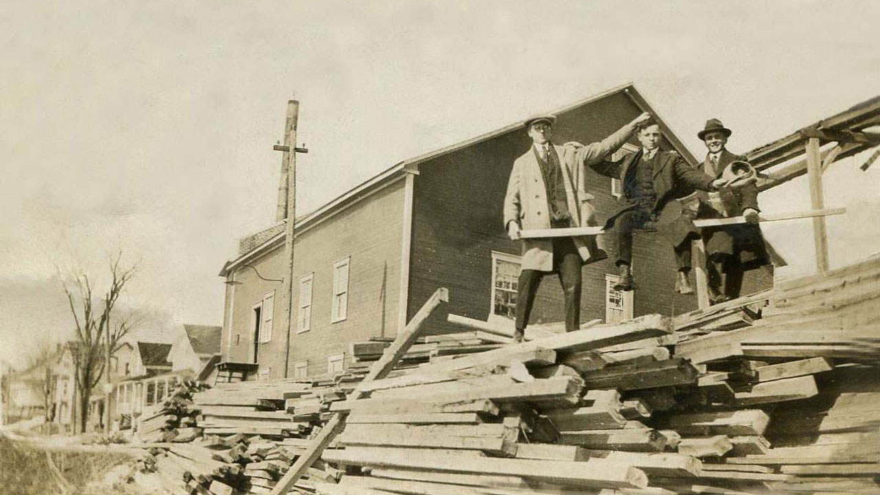 C'est en 1908 que cette histoire, qui a duré plus de 50 ans, a commencé, lorsque M. Napoléon Gilbert démarra un petit moulin à scie très modeste sur la 1re avenue dans le secteur du village Morency. On possède une vieille photo (photo 3) de la construction de ce premier moulin, tirée du journal l'Éclaireur de décembre 1958. J'y ai ajouté en médaillon la photo du fondateur Napoléon Gilbert, décédé en 1931 à l'âge de 60 ans. En 1912, son fils Isaïe Gilbert achetait l'entreprise, qui était devenue entretemps une manufacture de portes et chassis. Cette industrie prospère ne cessa de se développer et a connu une croissance rapide grâce aux progrès et améliorations au niveau des méthodes de production et à l'installation de machineries modernes. Entre 1909 et 1939, quatre fois l'entreprise fut victime d'incendies destructeurs, mais on a reconstruit et continué.