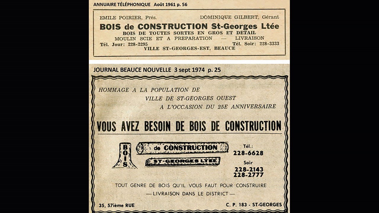 En 1958, deux changements majeurs surviennent, alors que l'entreprise change de nom et de propriétaire. Elle est acquise par M. Émile Poirier qui lui donne un nouveau nom: Les Bois de Construction St-Georges Ltée (publicités de 1961 et de 1974 à la photo 4). Le seul de la famille Gilbert qui reste à son emploi est Dominique qui agit temporairement comme gérant. Quelque temps plus tard, M. Poirier transfère l'entreprise à son fils Alyre Poirier et un autre actionnaire: M. Michel Rodrigue. En 1965, il ont modernisé à nouveau leurs installations et ont amélioré la productivité; en 1968, 60% de leur production était vendue sur le marché américain.