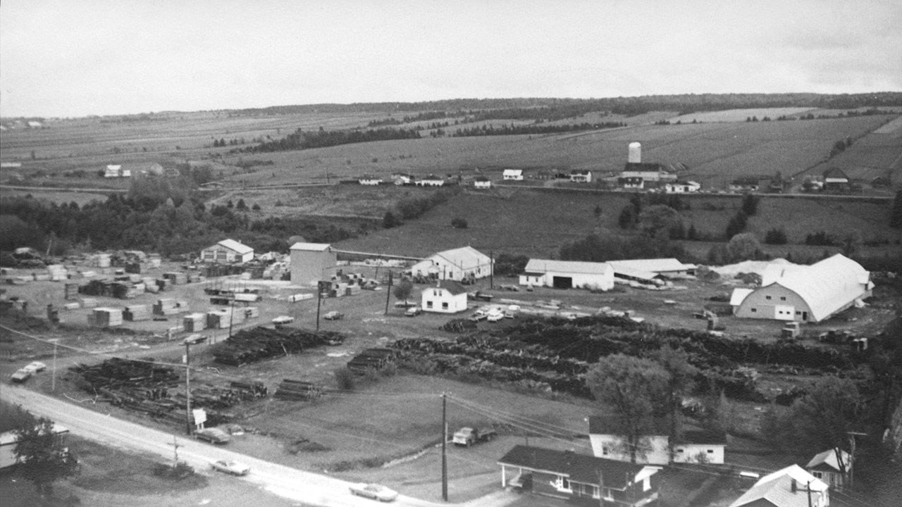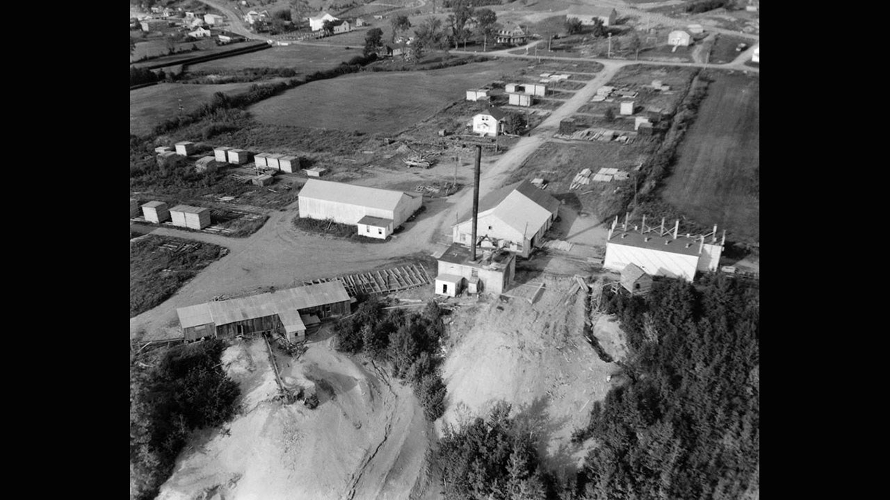 Voyez les quatre dernières photos qui nous offrent des images aériennes superbes des imposantes installations de cette entreprise après 1958. La 5 est des environs de 1975. Sur la 6e, on a une vue plus élargie de tout le secteur, dont la pointe où se rejoignent la 1re et la 2e avenue, ce qui nous permet de situer plus précisément où se trouvait cette scierie. À la photo 7, on voit les mêmes lieux sous un angle différent, en septembre 1958. La maison qu'on voit juste au-dessus de la cheminée était occupée par la famille de Roméo Grenier qui a travaillé à l'emploi de cette scierie pendant toute sa vie. Il était celui qui chauffait le «boiler», soit la bouilloire, car c'était alors un moulin à vapeur. Quand la vapeur était rendue suffisamment chaude, elle activait un engin qui à son tour faisait tourner un essieux de plusieurs dizaines de pieds de longueur (C'est cet essieu, un genre de tuyau, qu'on aperçoit entre les deux bâtiments du bas). Ce tuyau était relié au planeur qu'il faisait fonctionner.