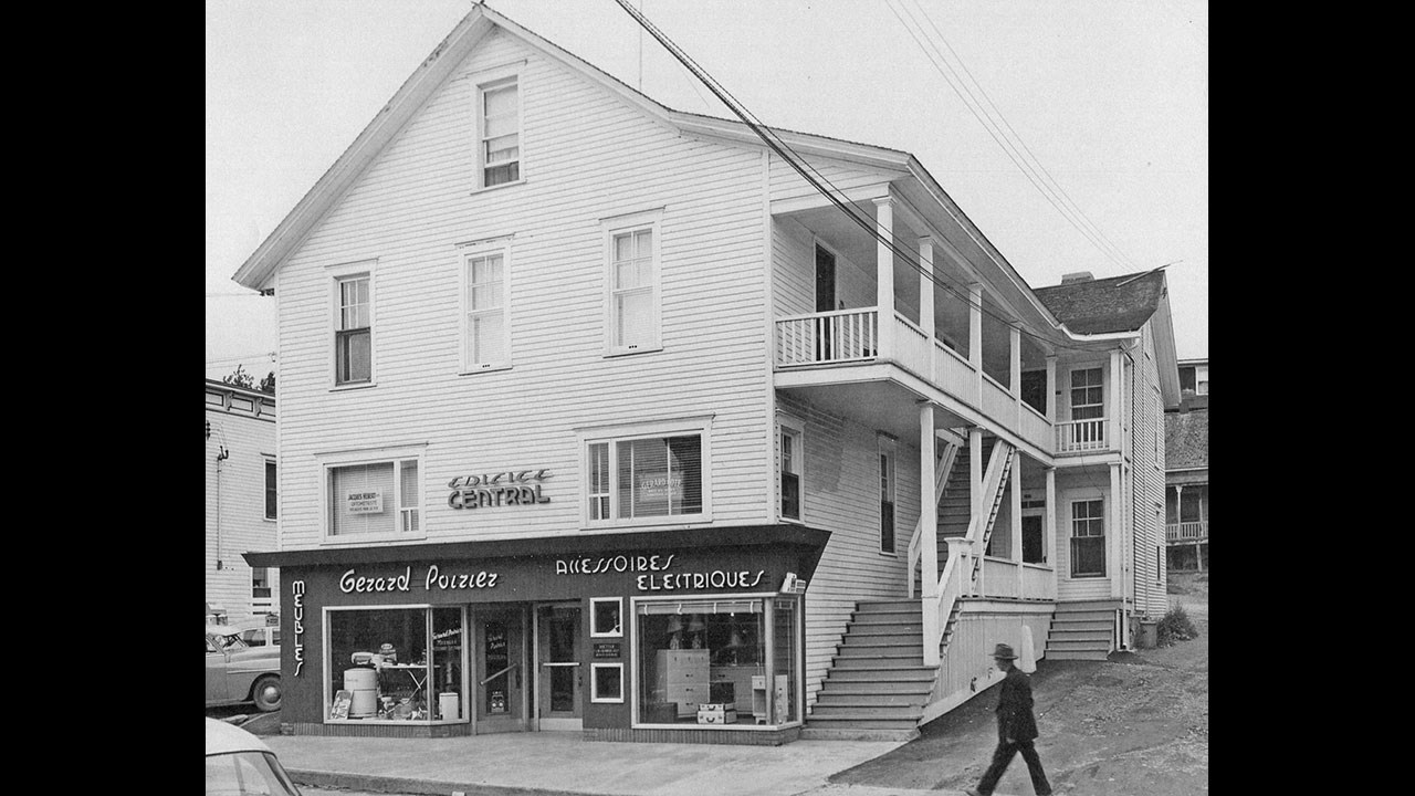 Au cours des décennies suivantes, après que Gérard eût fermé son magasin (vers 1942) pour s'occuper des autres entreprises de commerce de bois de son père, lui et son frère Andréa le transformèrent en bâtisse commerciale, lui donnant le nom d'Édifice Central (photo 4). Si on compare la 3e photo avec la 4e, on constate que la devanture de l'immeuble a été modifiée à une certaine époque: l'escalier donnant accès au commerce a été éliminé et le sous-sol est devenu rez-de-chaussée. C'est à cet endroit que Gérard Poirier fonda et opéra son premier magasin de meubles en 1952, comme on peut le constater à la publicité affichée sur la façade; à cette époque, il y avait des bureaux au second étage, dont celui de l'optométriste Hubert Gendreau (à gauche sur la photo 3) et le commerçant Gérard Côté marchand de bois en gros à droite.