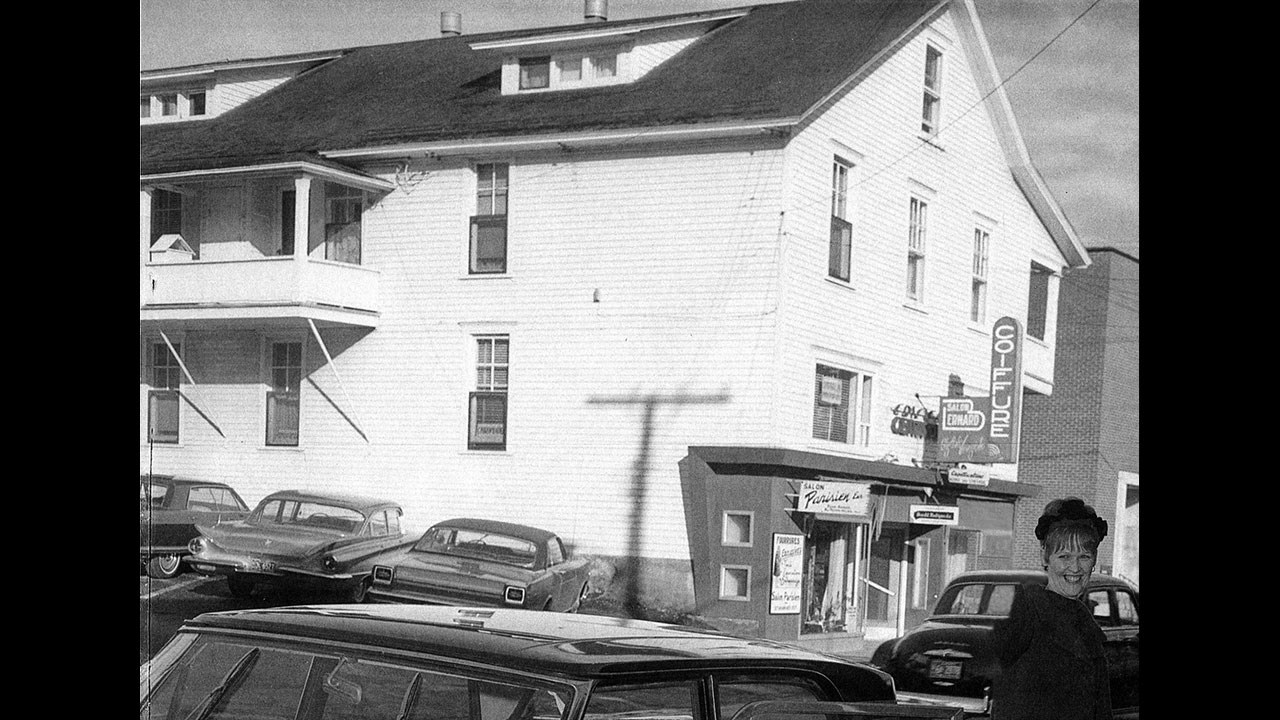 À la photo 5, les enseignes et annonces nous informent d'autres commerces ayant occupé ces lieux: Le Salon de coiffure Bernard du nom de son propriétaire Jacques Bernard qui était alors le seul homme à coiffer des dames à cette époque. Aussi le Salon Parisien qui vendait des vêtements pour dames. Et juste au-dessus de la porte d'entrée l'affiche du nom du chiro Donald Rodrigue dont le bureau était situé dans cet immeuble. Par la suite, l'immeuble a accueilli divers commerces et bureaux, dont Alliance Voyage (photo 6, 13 août 1966.