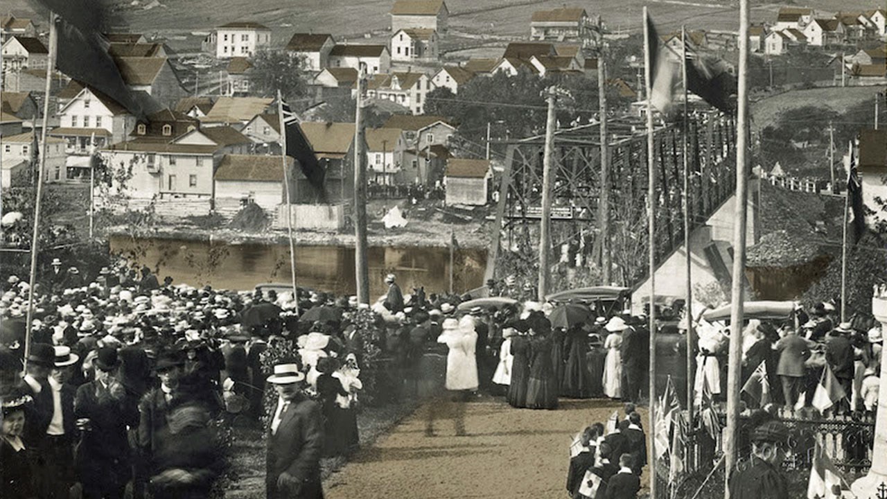 En fait, ce sont deux constructions nouvelles qui ont donné lieu à ce rassemblement aussi grandiose. À l'été 1912, on installa le fameux monument de Saint Georges sur la grande place en face de l'église, sur le socle qui s'y trouve encore aujourd'hui. Et encore à la même époque, même année, on a mis en service le premier pont de fer qui reliait les deux rives en plein centre-ville, en face de l'église. Or même si on inaugura ces deux structures à l'été 1912, leur double bénédiction officielle n'a eu lieu que l'année suivante, dans la journée du dimanche 15 juin 1913.