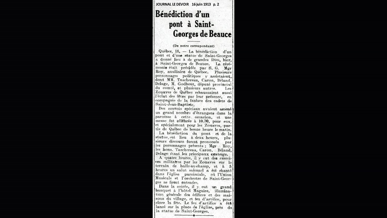 Ce fut une grande fête qui a nécessité une longue préparation. Pas de radio, pas de télévision ni d'ordinateur. Il fallait donc une planification laborieuse pour organiser un tel événement. On n'a pas fait les choses à moitié, on voulait être sûr de présenter un événement digne de ce nom. Pas moins de dix wagons arrivèrent de Lévis avec des invités d'honneur. La plupart des dignitaires de l'église et de la politique de la région étaient présents. Il y avait même le corps des zouaves pontificaux, commandé par le Dr Jules Dorion. Après les bénédictions, il y eut de nombreux discours prononcés par M. le Curé A. Dionne, par le maire de Saint-Georges M. Joseph Gilbert, ainsi que plusieurs politiciens connus. Voyez la foule massée sur la grande place de l'église (photos 1 et 2). Le rassemblement débordait tout autour de l'église (photo 3). La fanfare entonna plusieurs pièces de musique entrainante pour réchauffer l'atmosphère (photo 4). On arborait de nombreux drapeaux parmi la foule, même celui de la France (photo 5). Cette nouvelle fit même l'objet d'un article dès le lendemain dans le journal Le Devoir (photo 6).