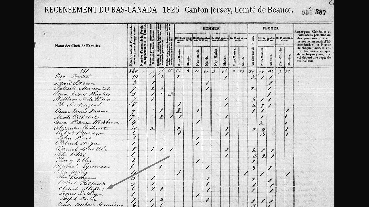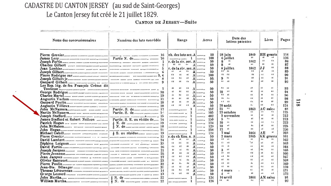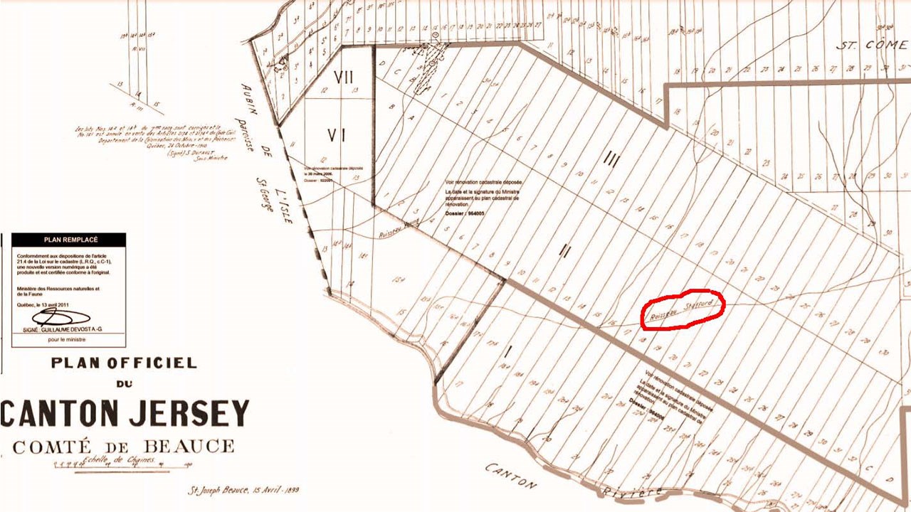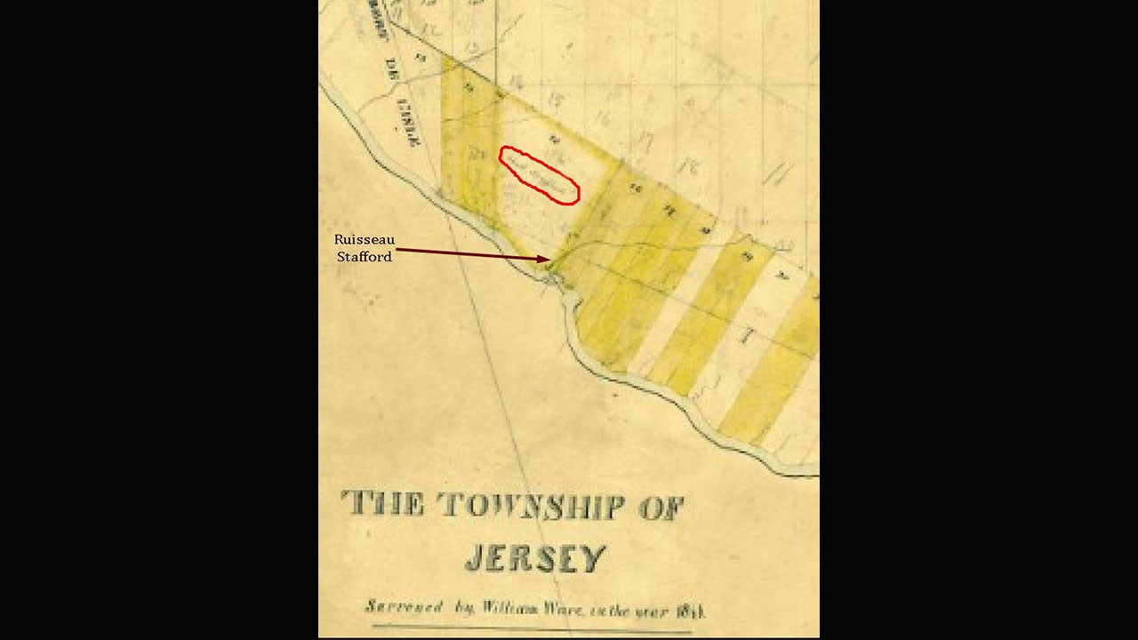 Pourquoi l'appelle-t-on «la Stafford»? Tout simplement parce que dans les années 1800, trois générations de Stafford furent propriétaires du lot où se trouve une partie importante du ruisseau en question. D'abord le père Obadiah dans les années 1820-50, puis son fils Joseph Stafford dans les années 1860-80 et le petit-fils Josiah jusqu'au début des années 1900. Voyez le recensement de 1825 où le nom du père est inscrit (document 3) de même que sur les plans des lieux en 1834 (docu 4) et en 1841 (docu 5). Au tour du fils Joseph d'être mentionné au cadastre à titre de propriétaire depuis le 5 novembre 1863 du lot 15 de 482 acres où se trouve le fameux ruisseau (docu 6). Et un plan de 1899 où le nom «ruisseau Stafford» est même écrit (docu 7). Ces importants documents démontrent de façon incontestable l'origine de cette appellation en référence au nom des propriétaires des lieux.