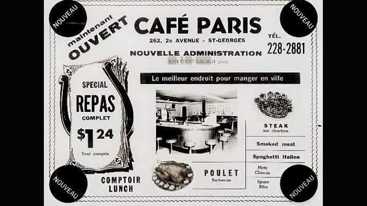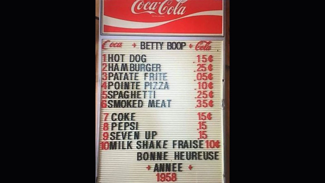 Avez-vous connu l'époque où on pouvait savourer une «patate, sauce, pois» pour 25c ? Accompagnée d'une liqueur pour 15c ? Et si vous aviez un p'tit goût de sucré, pourquoi pas ajouter un «flotteur» aussi appelé «ilot sur Coke», soit une boule de crème glacée dans un verre de Coke pour 20c ? Ces items étaient disponibles au Café Paris. Autre exemple de menu d'un casse-croute en 1958, photo 2. C'était le coût de la vie il y a 65 ans.