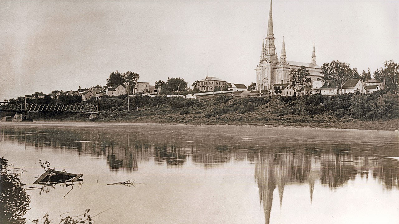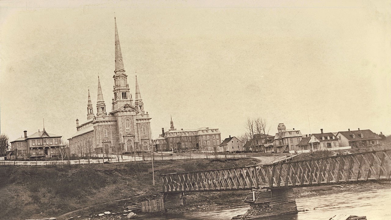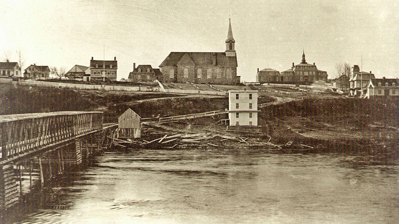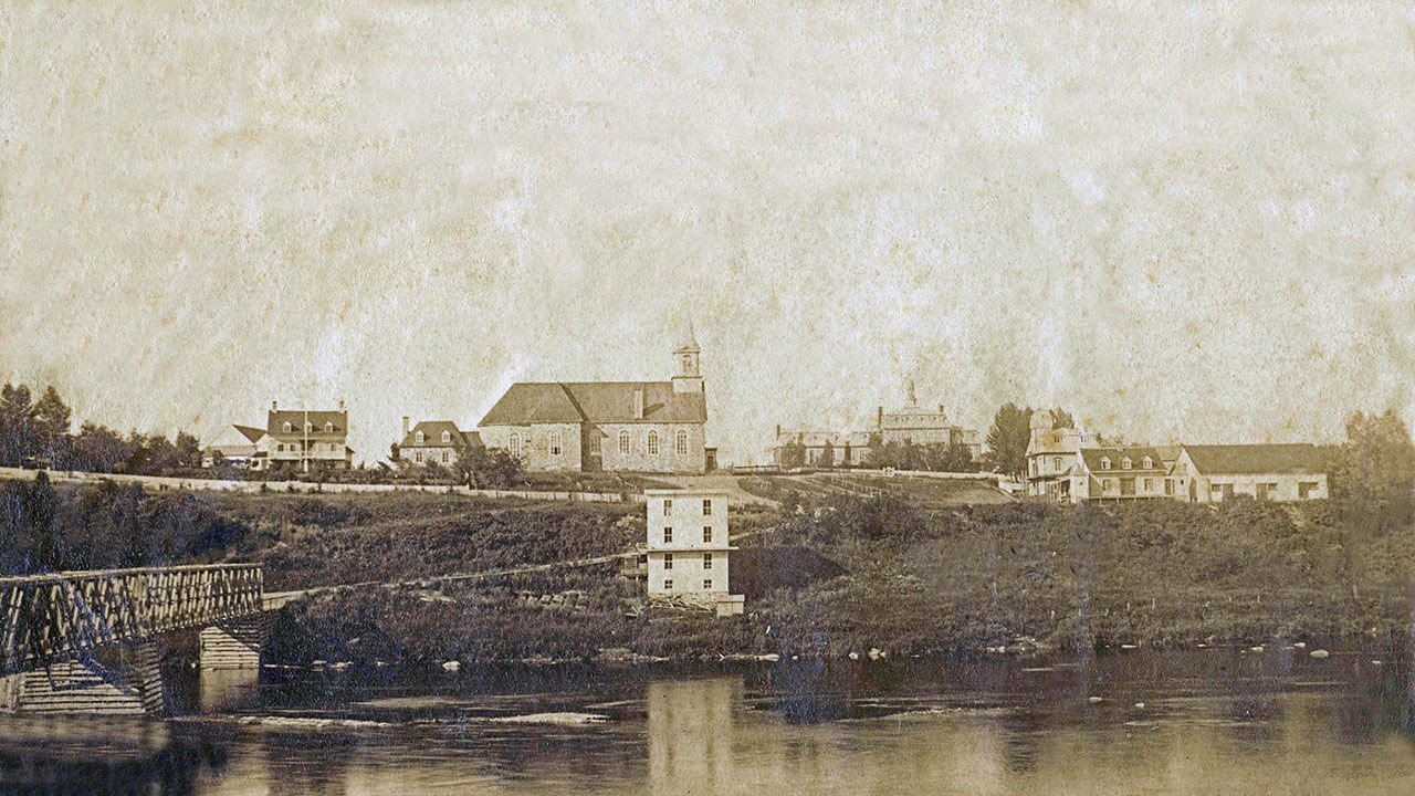 La SHS détient heureusement de superbes photos anciennes de ce secteur. Une chose en commun à toutes les photos accompagnant ce texte: on y voit la rivière Chaudière. Impossible de déterminer la date précise de chacune, les dates sont approximatives. La première est la plus ancienne, vers 1882, on y voit le premier pont de bois, qui était un pont couvert, mais dont le concepteur a enlevé le lambris de bois quelque temps plus tard, car le vent arrachait constamment les planches. Cette église a été construite en 1862. La rue St-Ferdinand (18e rue) n'existe pas encore.