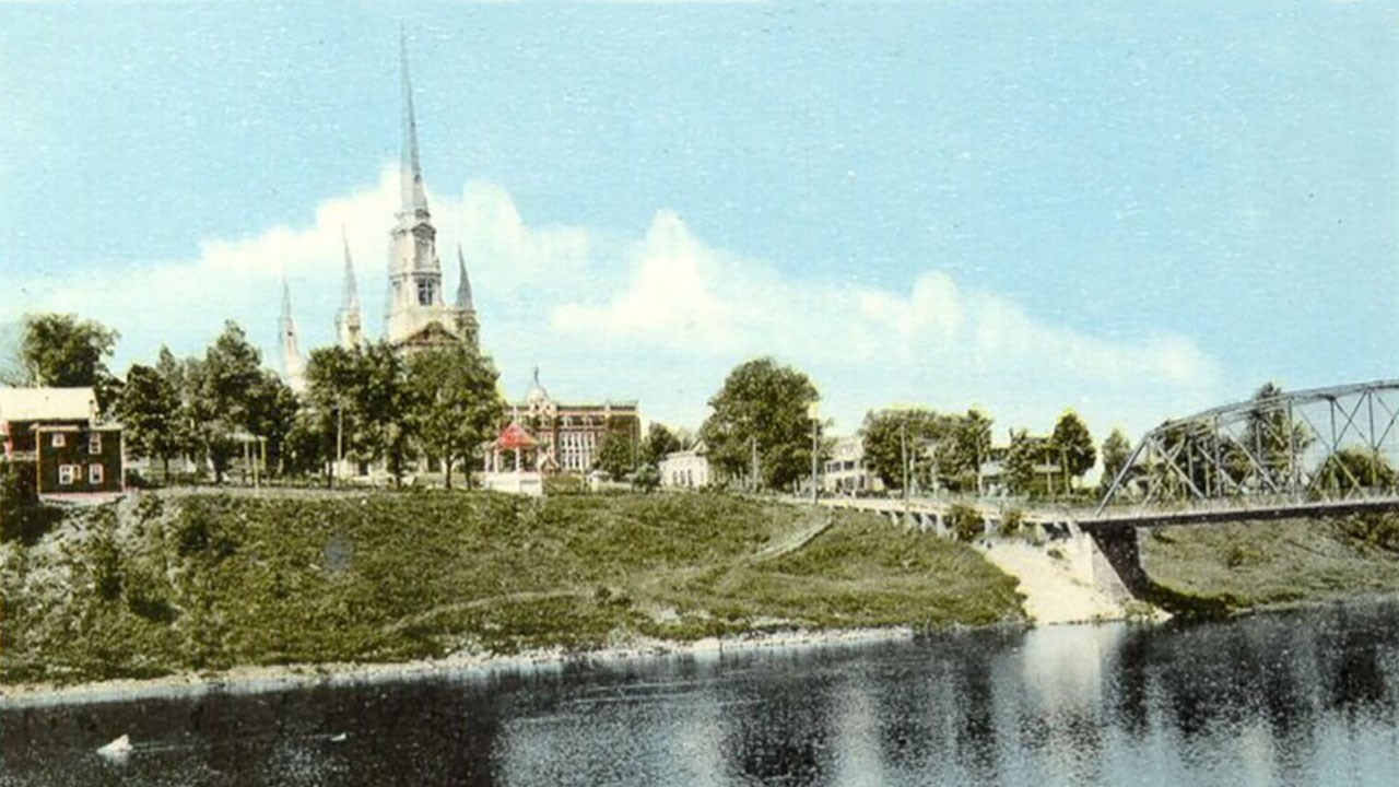 7e photo, vers 1940: encore trois nouvelles structures: le dernier pont de fer, construit en 1929. La salle paroissiale (érigée en 1939) et le kiosque érigé vers 1915. C'est le photographe qui s'est amusé à colorer cette photo. De plus le couvent n'est plus le même. Ayant brûlé en 1923, on en a reconstruit un nouveau la même année, il est encore là aujourd'hui, c'est le centre culturel Marie-Fitzbach.
