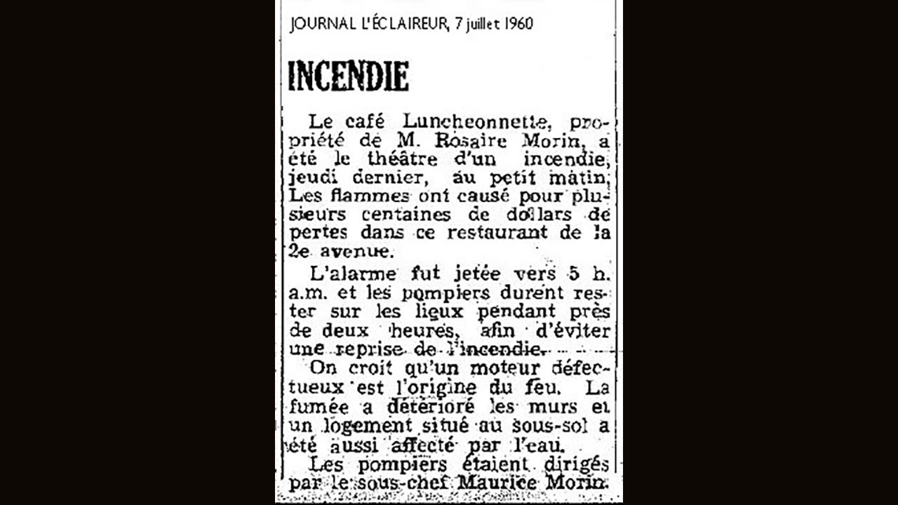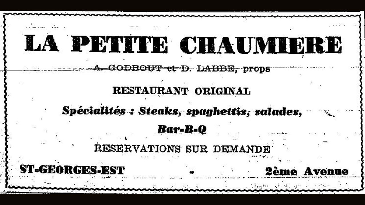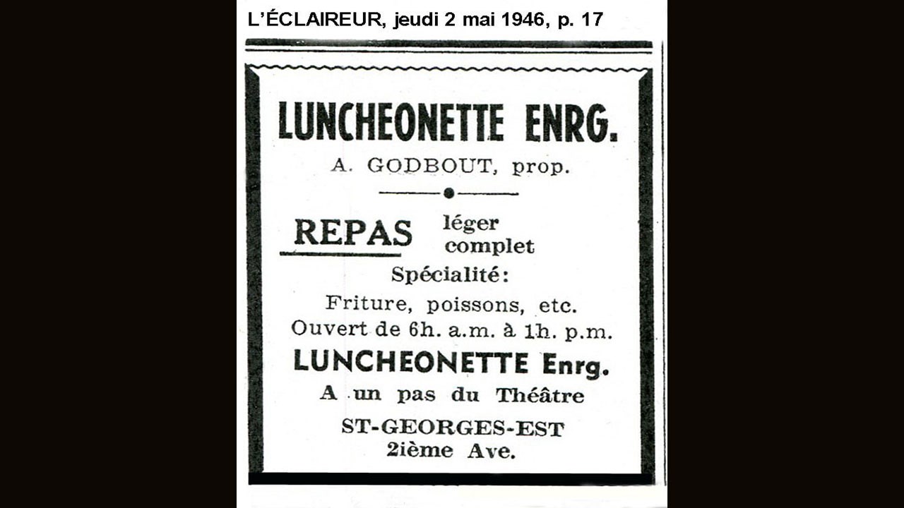 On y a aussitôt érigé un restaurant qui prit le nom de «Luncheonnette», le premier l'ayant exploité étant Auguste Godbout, comme le démontre une publicité du 2 mai 1946 (photo 3). Il était ouvert de 6h am à 1h pm et on pouvait se faire servir un repas léger et complet, entre autres de la friture et du poisson. Ernest Grenier y a déjà été cuisinier. Par la suite, ce furent les frères Marcel et Yvon Gilbert qui ont acquis cet établissement vers 1950, tandis qu'Auguste Godbout a démarré un autre restaurant pas très loin, dans l'édifice de A.S Paquet au coin de la 120e rue, sous le nom de «La Petite Chaumière» (photo 4). Le Luncheonnette a donc appartenu aux frères Gilbert pendant plusieurs années (photo 1). Il y avait une machine à boules près d'une fenêtre en avant. À cette époque, plusieurs ouvriers et ouvrières de la St-Georges Shoe allaient y prendre leur diner à tous les vendredis. Puis vers la fin des années '50, un dénommé Rosaire Morin (à Norbert et non celui du Café Paris) est devenu à son tour opérateur du Luncheonnette.