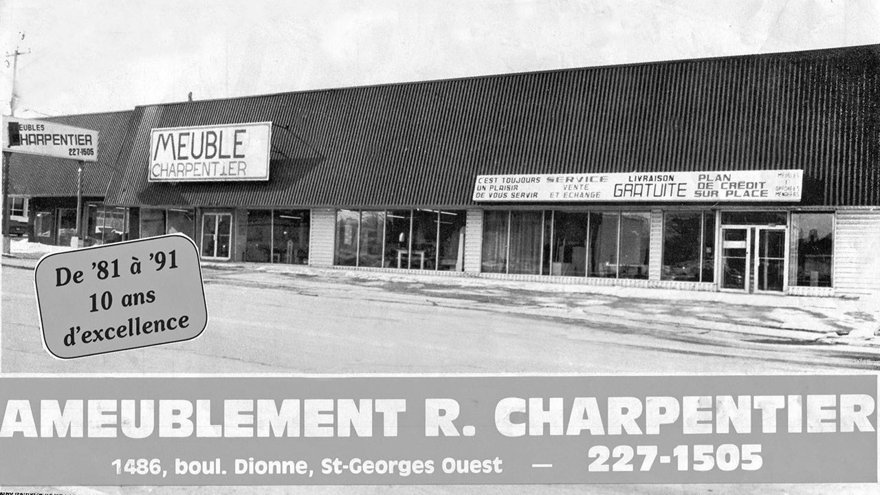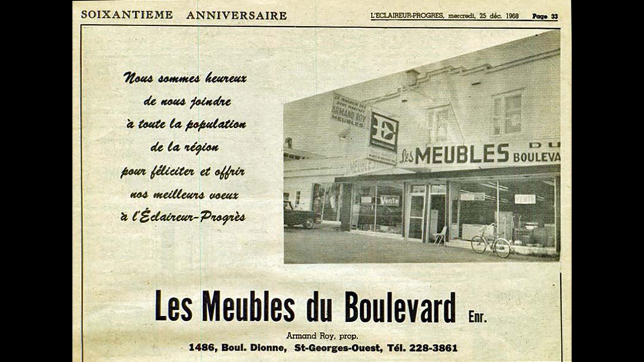Les ainés ont connu autrefois ce magasin de meubles qui était situé sur le boulevard Dionne, entre les 14 et 15e rue à Saint-Georges ouest (photo 1 du 21 février 1975). C'était il y a 50 ans. C'est l'homme d'affaires Armand Roy «Mazor» qui a fondé ce commerce vers 1963. Il était très dédié à son travail et savait accueillir chaleureusement les clients. Il faisait beaucoup de publicité à la radio et dans les journaux (photo 2). Il lui est aussi arrivé de participer à l'exposition commerciale qui avait lieu à Saint-Georges à chaque année, voyez son kiosque à la 3e photo; vous y reconnaitrez sa fille Francine qui recevait les visiteurs. En 1975, manquant d'espace, M. Roy a agrandi, et même doublé la taille de son établissement (photo 4).