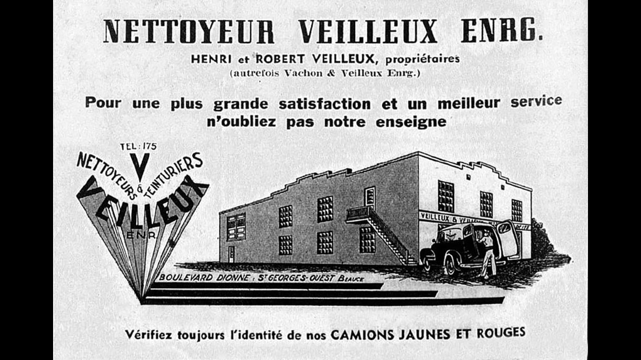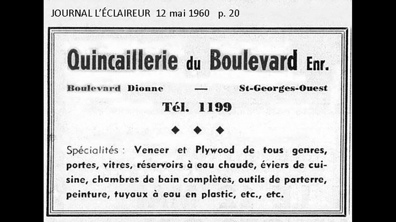 Avant que le magasin des Meubles du Boulevard soit fondé par Armand Roy, ce site sur le boulevard Dionne fut occupé par d'autres commerces. De 1960 à 1962, il y a eu la Quincaillerie du Boulevard, dirigée par Conrad Plante et Raoul Boucher (photo 7). Et avant cette quincaillerie, il y a eu le Nettoyeur Veilleux des frères Henri et Robert Veilleux, au cours des années '50, dont on voit une publicité à la photo 8. Ce n'est pas une photo de l'édifice, mais on y a reproduit une silhouette de la façade, qui est la même que sur la première photo, la partie avant de la façade est découpée en escalier sur les deux illustrations.