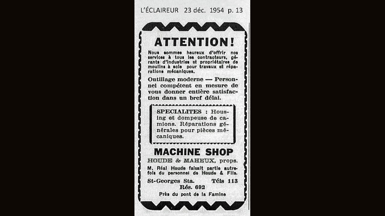 L'un des plus anciens ateliers de machinistes à Saint-Georges fut probablement celui d'Edgar Houde, qui fut fondé en 1924. À cette époque, presque tous les noms d'entreprises ou commerces étaient à consonance anglaise, alors il s'annonçait sous le nom de «Saint-Georges Machine Shop», comme on le constate à son affiche devant son atelier dans la rue Saint-Antoine (120e rue) à la première photo. Ses quatre fils ont appris le métier avec leur père, dès l'âge de 12, 14 ou 15 ans, et ont travaillé tous les quatre pour lui dès 1936. C'étaient Pierre-Georges, Marcel, Maurice et Réal, comme on l'indique à un article paru dans le journal local en 1944 (photo 2).