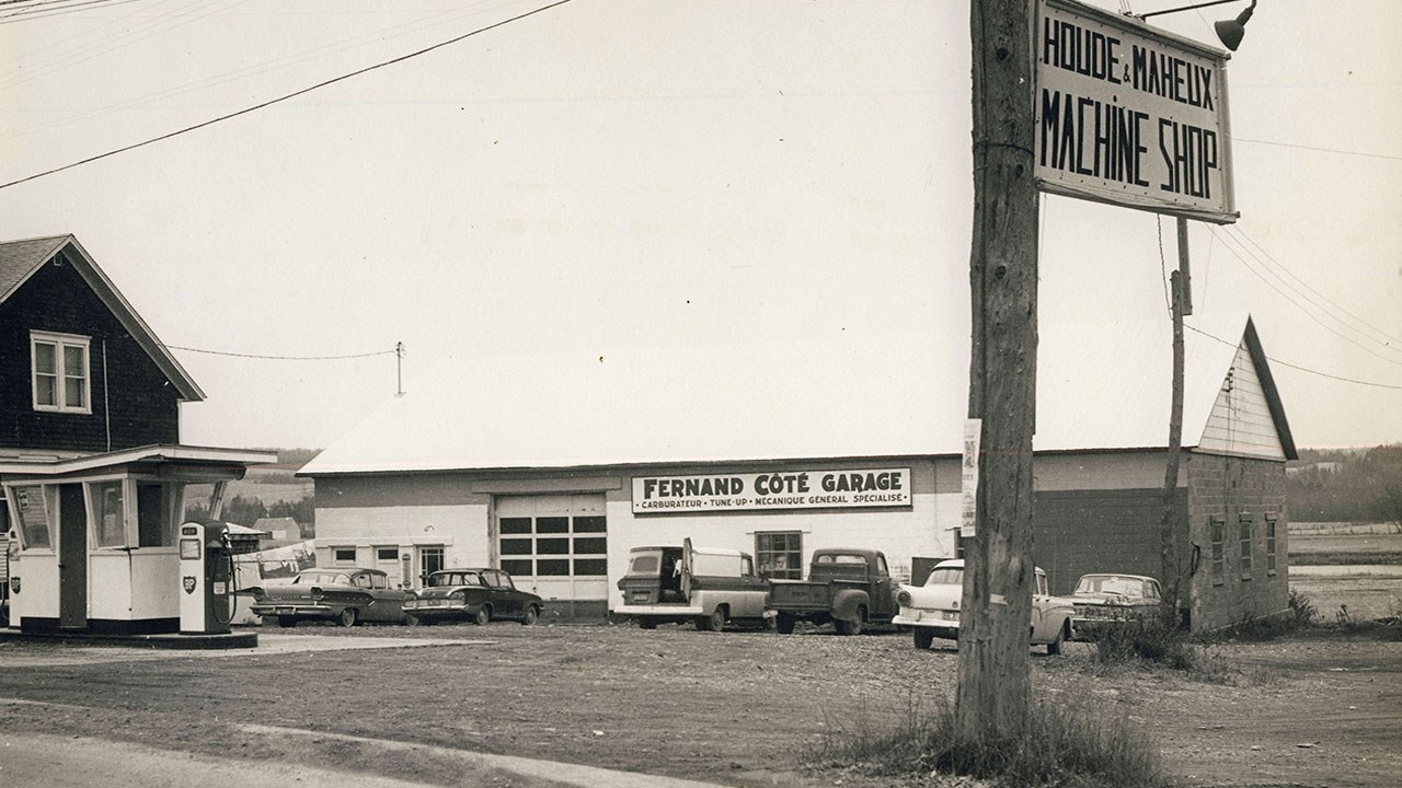 En effet, en 1954, le plus jeune des quatre frères, Réal, s'associa à son beau-frère Gabriel Maheux (Réal était marié à Thérèse Maheux, soeur de Gabriel) pour fonder leur propre atelier de mécanique (photo 5). Ils avaient alors tous les deux près de 15 ans d'expérience dans le domaine et se lancèrent en affaires. Dans les débuts, leur nom était HOUDE ET MAHEUX MACHINE SHOP (photo 6). Leur publicité mentionnait «M. Réal Houde faisait partie autrefois du personnel de Houde et Fils» (photo 7). Le succès fut immédiat et la demande augmentait continuellement, à tel point qu'ils se sont construits dès l'année suivante, en 1955, un imposant local situé à l'entrée sud du pont de la Famine, où l'entreprise est encore aujourd'hui. Voyez l'enseigne sur une ancienne photo des années '60 (photo 8 ). Et une photo récente de leur établissement (photo 9).