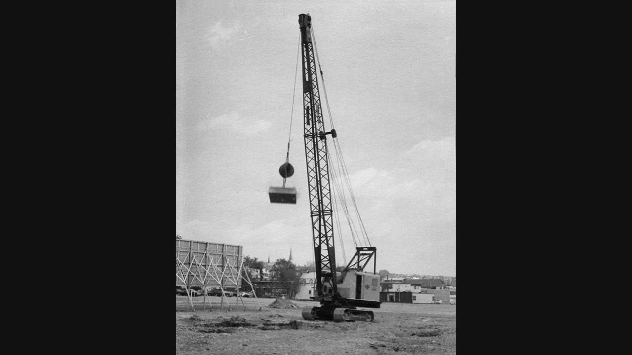 Sous l'habile direction du maire Pinon, au cours des années 1966 à 1968, on déménagea l'ile Gilbert pour aménager l'avenue Chaudière et on érigea le fameux quai Pinon. Hélas on manqua de terre pour remplir le trou laissé vacant entre la 1re avenue et la nouvelle avenue Chaudière; ce n'est qu'en 1974 que se termina le remblayage. Mais, avant même de commencer la construction, il a fallu compacter le terrain, travail compliqué que s'est éternisé. Voyez la grande grue qui fut utilisée (photo 2). Un poids énorme était soulevé haut dans les airs, puis on le laissait tomber lourdement au sol. La grue devait se déplacer pour chaque manoeuvre de façon à compacter à la grandeur. Hélas, le câble d'acier utilisé se cassait constamment, ce qui entrainait à chaque fois des coûts considérables en perte de temps et en remplacement du câble. Les travaux furent suspendus pendant plus d'un an et le premier entrepreneur se désista.