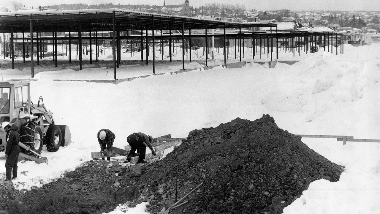L'histoire de ce centre d'achats est vraiment particulière (photo 1). Sa construction s'est étirée sur une période d'environ quatre ans! En vérité ce fut toute une saga. Faut savoir qu'avant 1970, le site où fut érigé plus tard cet immeuble n'existait tout simplement pas, c'était la rivière à cet endroit. On a déjà expliqué ici qu'il a fallu environ 20 ans pour terminer les énormes travaux entrepris progressivement à partir de 1955, visant à refaçonner le secteur le long de la rivière Chaudière et à changer à jamais le visage du centre ville.