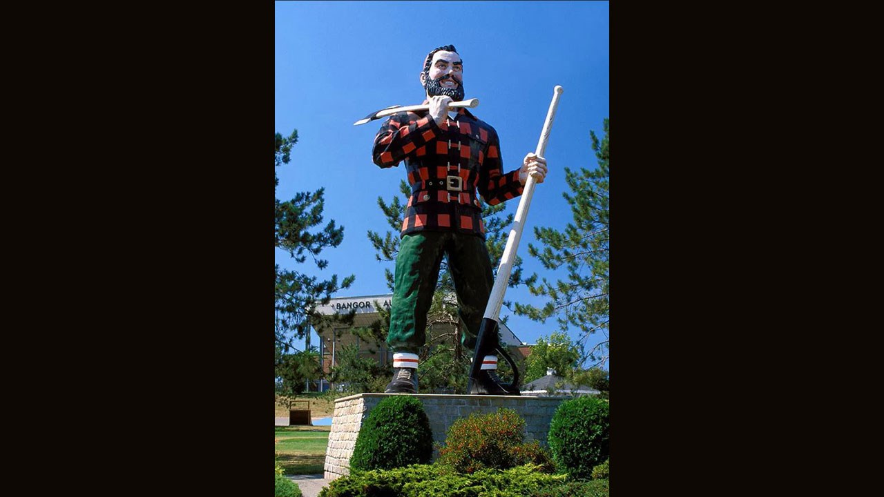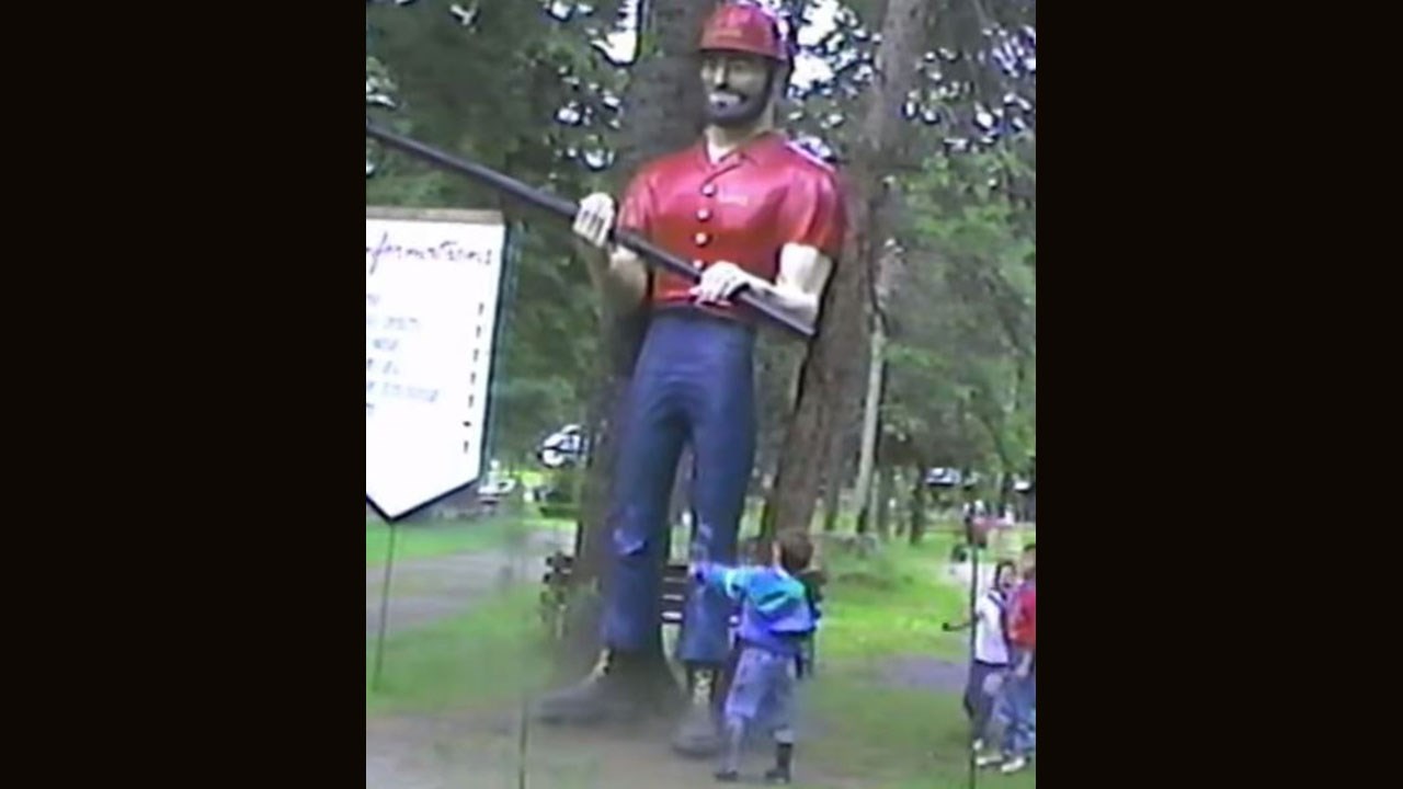 Un lecteur a publié récemment un vidéo montrant les activités des enfants qui fréquentaient le Parc des 7-Chutes dans les années '90. On a la chance d'y voir la fameuse statue de Luc Lombard en couleur (photo 2, tirée de cette vidéo de Thierry Charest). Elle semble même en très bon état. On a enlevé la scie à chaine et on l'a remplacée par une perche à laquelle est suspendu un panneau informatif. En vérité, le vrai personnage représenté serait plutôt un héros légendaire, Paul Bunyan. Il existe des centaines de ces imposantes sculptures de ce héros mythique dans de nombreuses villes et parcs américains. On y aperçoit toujours le populaire Paul Bunyan dans diverses postures de bûcheron, souvent avec sa hache. On en voit une de 31 pieds de hauteur qui est exposée à Bangor dans le Maine (photo 3). Ces statues faites de fibre de verre sont aujourd'hui considérées comme des oeuvres d'art. Dommage que la nôtre ait été détruite.