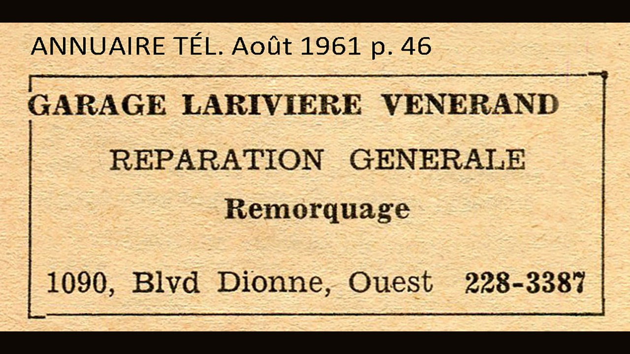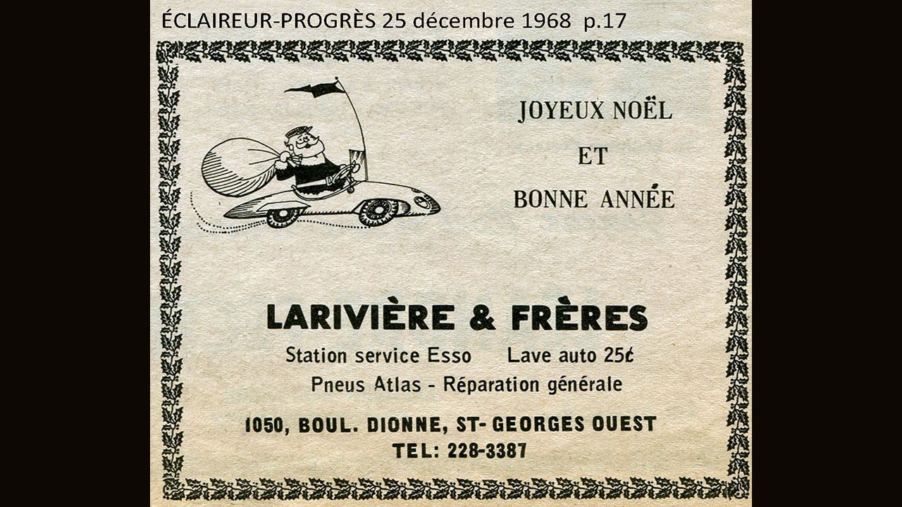 Photo 1 du fonds Claude Loubier. Photo 2 publicité dans l'annuaire téléphonique d'août 1961 et photo 3 publicité parue dans l'Éclaireur-Progrès du 25 décembre 1968 p. 17. Texte et recherches de Pierre Morin.